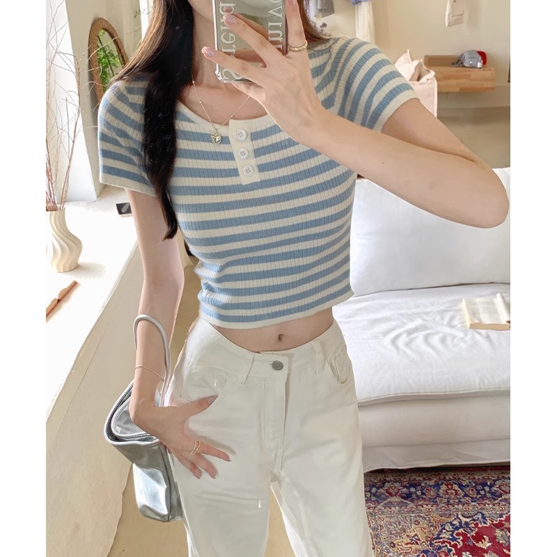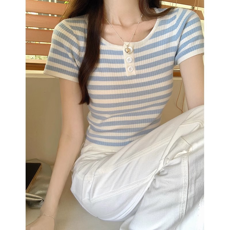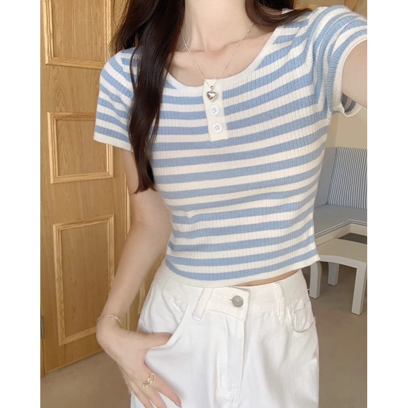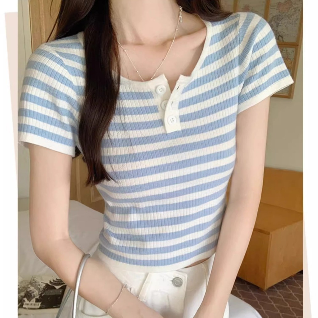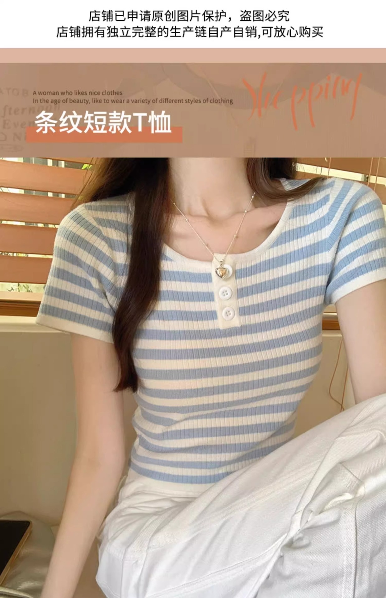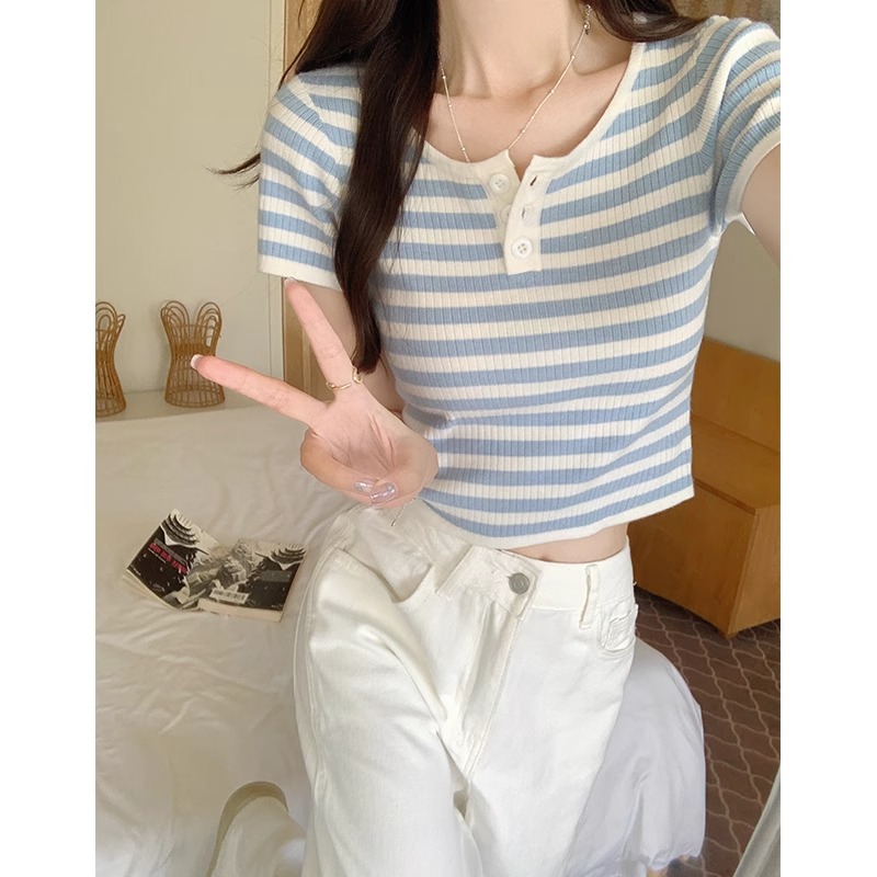 蓝白条纹正肩针织短袖T恤女夏季冰丝薄款辣妹修身短款露脐小上衣