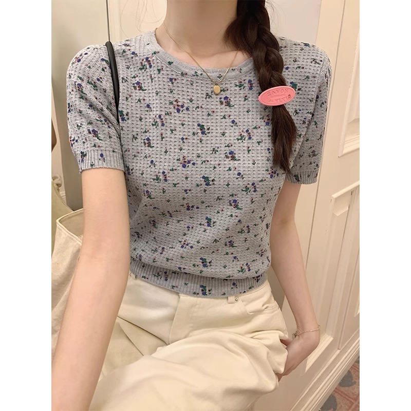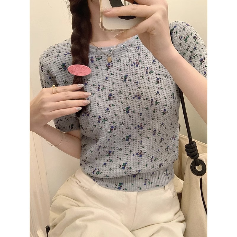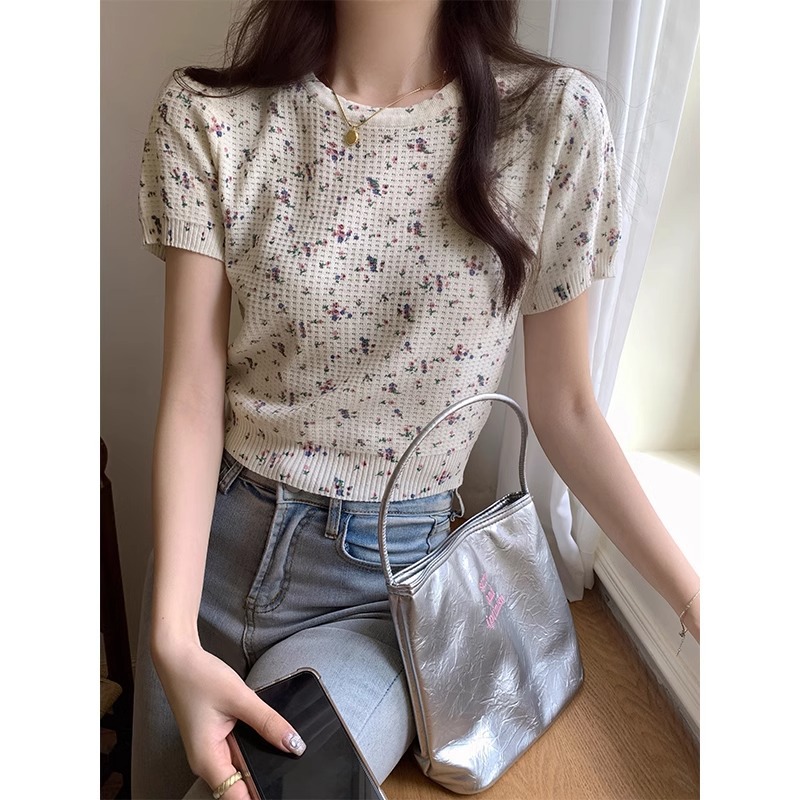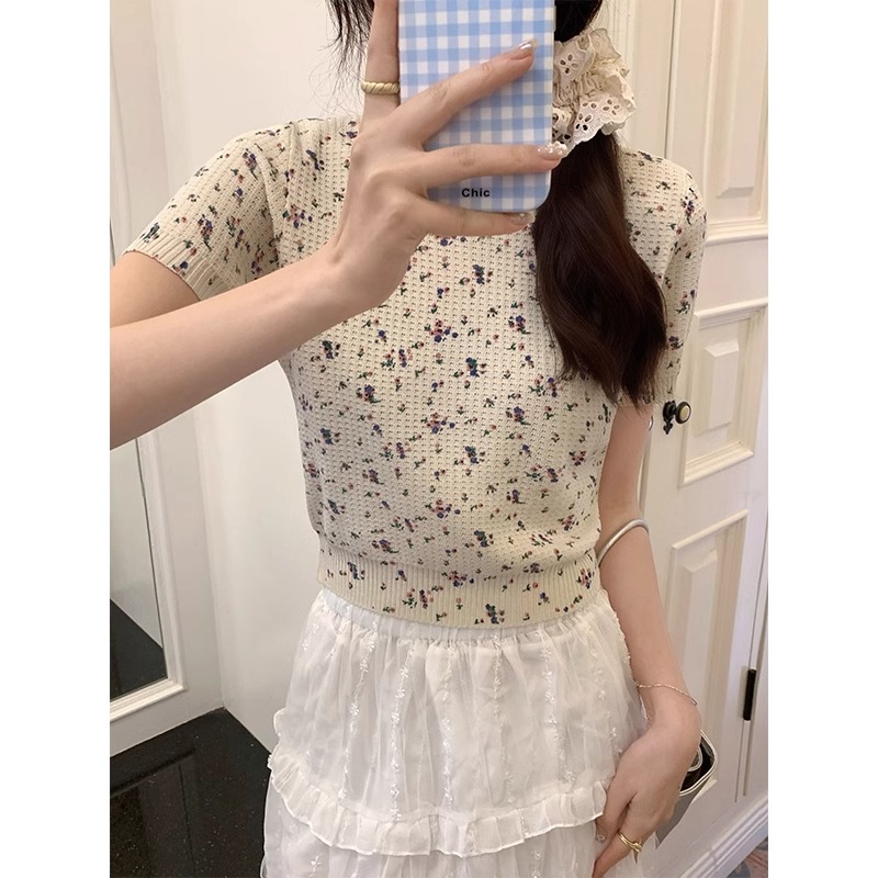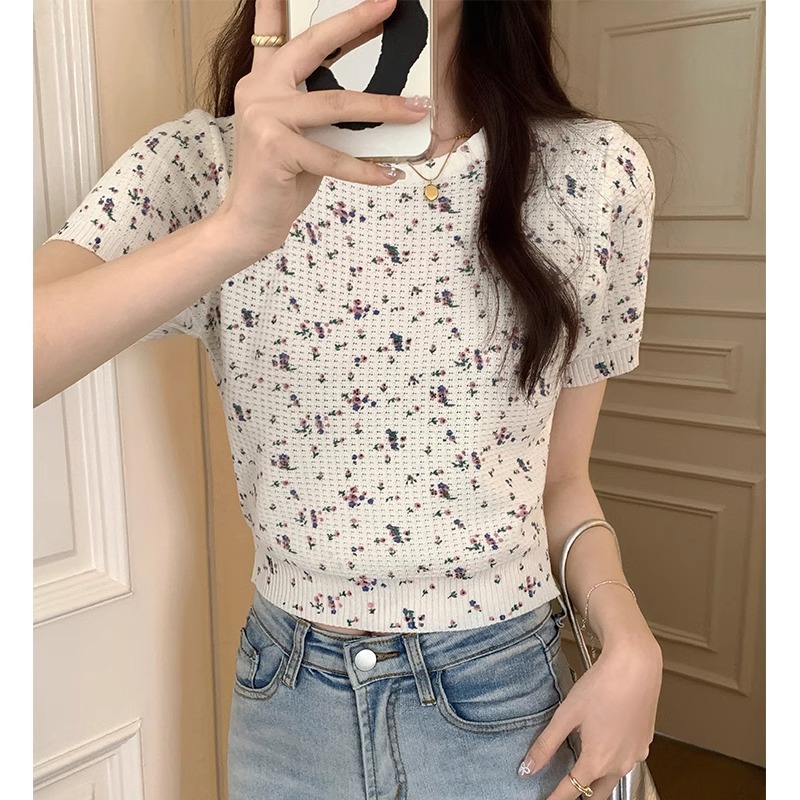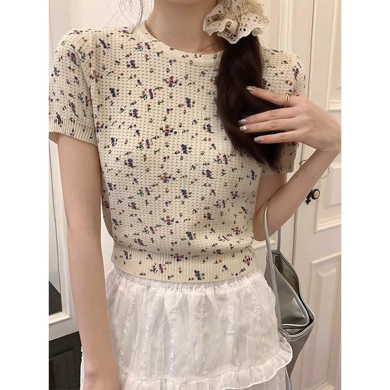 韩系甜美小清新圆领正肩短袖t恤女春夏新款纯欲碎花针织上衣