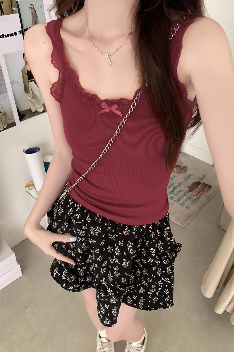 纯欲性感蕾丝花边吊带背心女夏外穿修身显瘦短款红色无袖上衣内搭