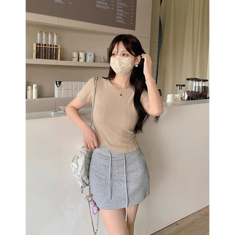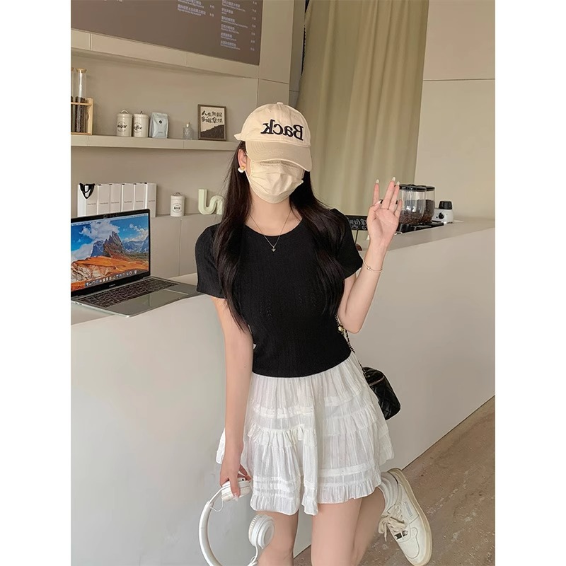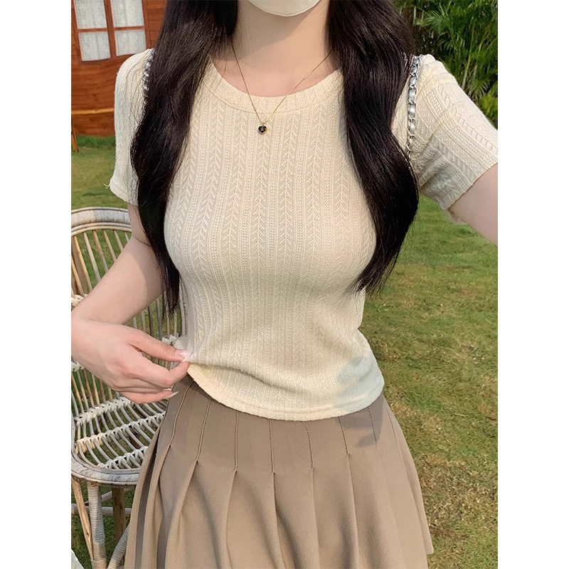 韩版夏季百搭纯色上衣短款修身圆领显白正肩短袖甜辣妹T恤女
