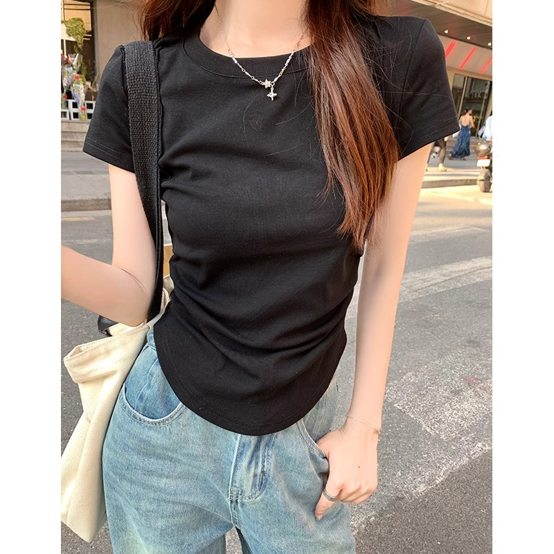 韩版纯色百搭修身短款BM风上衣侧边褶皱短袖夏季显白女款T恤