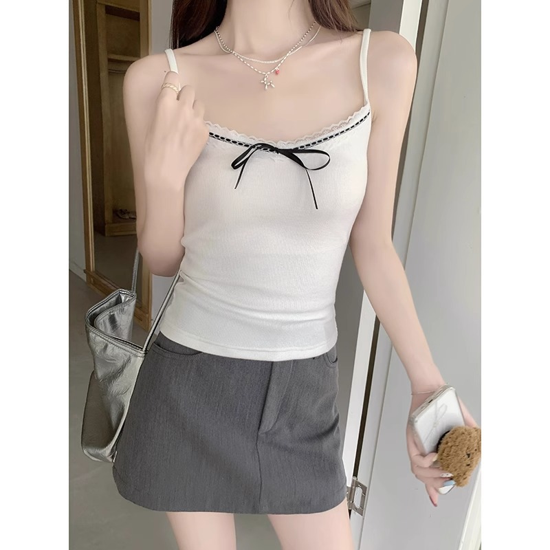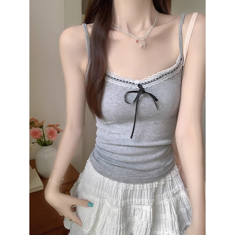 韩版多巴胺纯色温柔感无袖上衣短款露脐蝴蝶结花边蕾丝小背心女