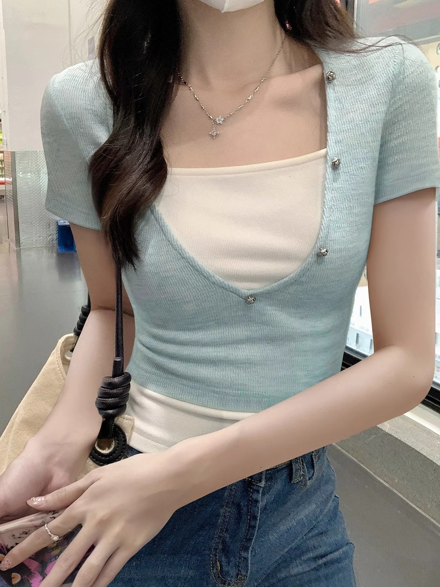 粉色显白多巴胺短袖T恤女拼接假两件半开领正肩收腰修身夏季上衣