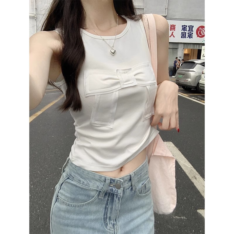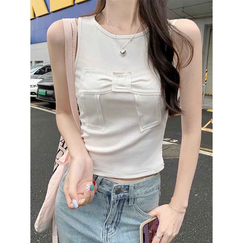 美式复古圆领露肩甜辣蝴蝶结别致无袖上衣修身纯欲夏季吊带背心女