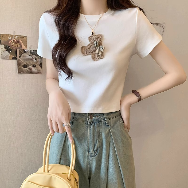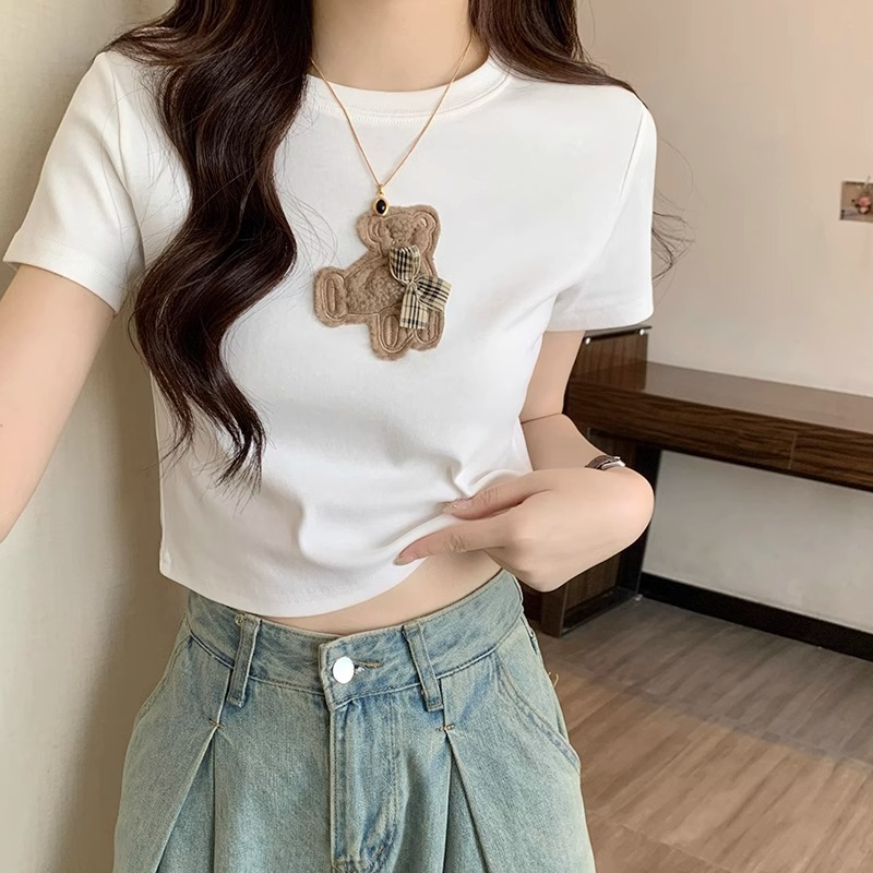 复古小熊白色正肩t恤女短袖春夏新款辣妹修身设计感短款半袖上衣