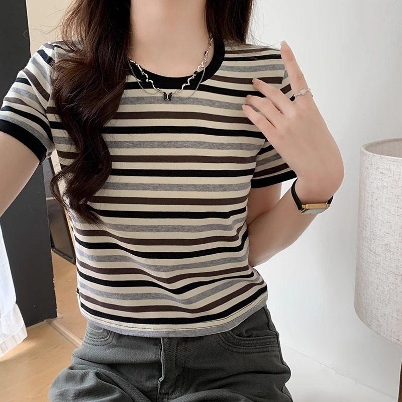 绿色条纹正肩t恤女短袖春夏设计感美式复古修身撞色内搭短款上衣