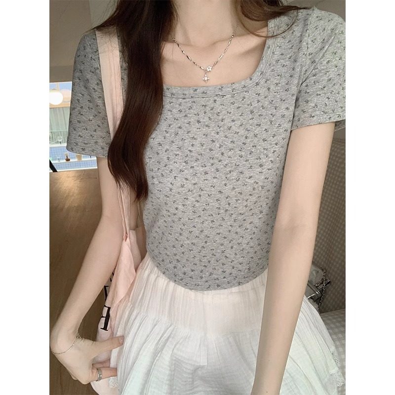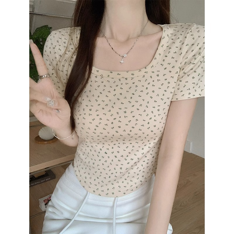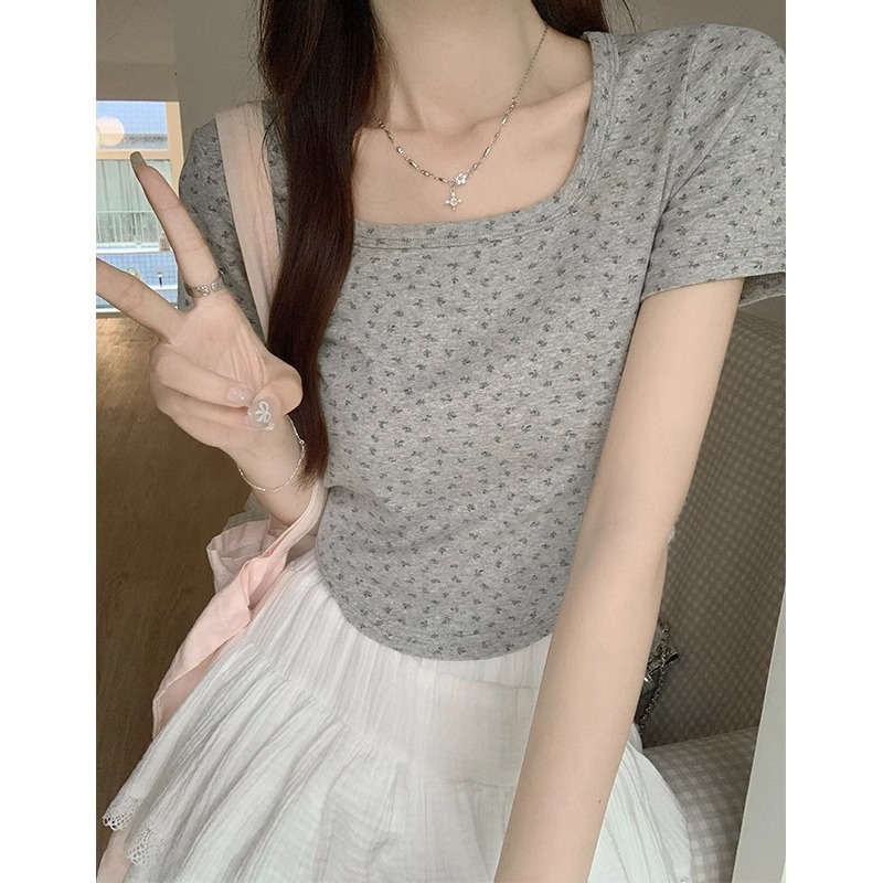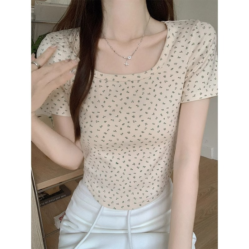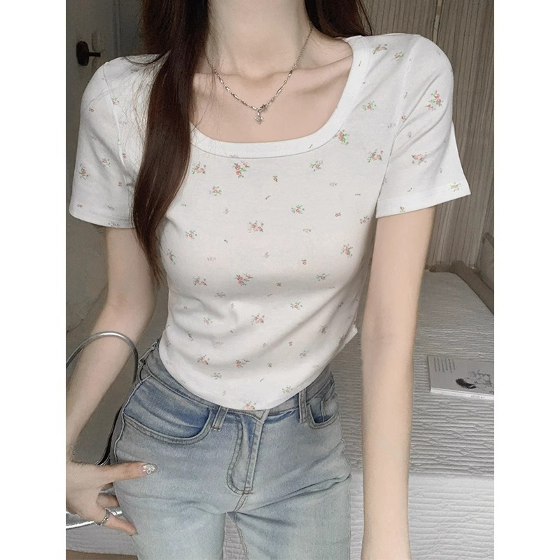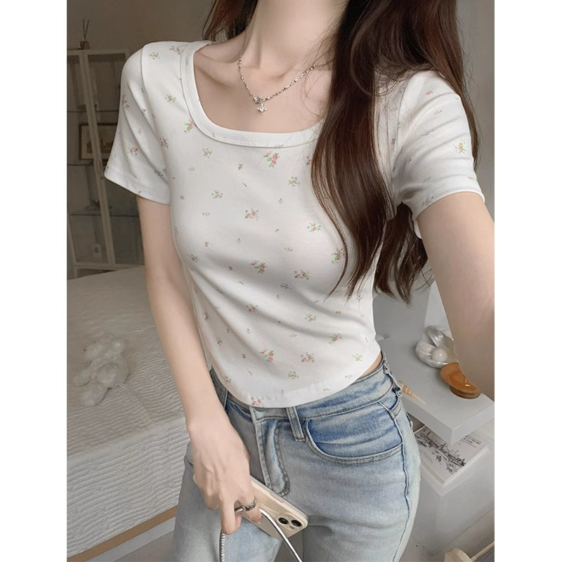 bm纯欲碎花夏季短袖T恤大方领下摆弧形修身显瘦日常百搭短款上衣