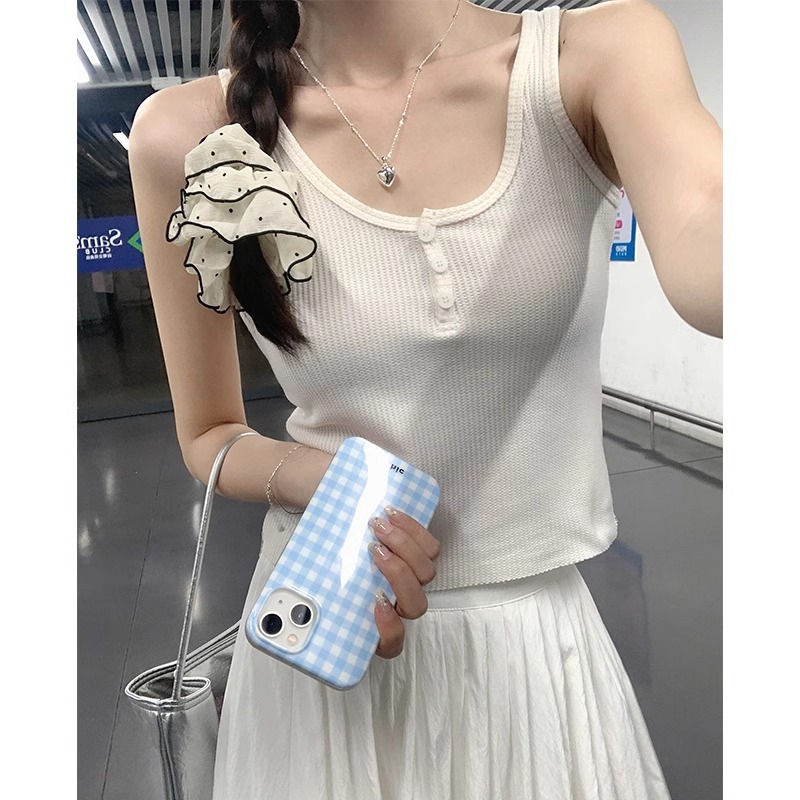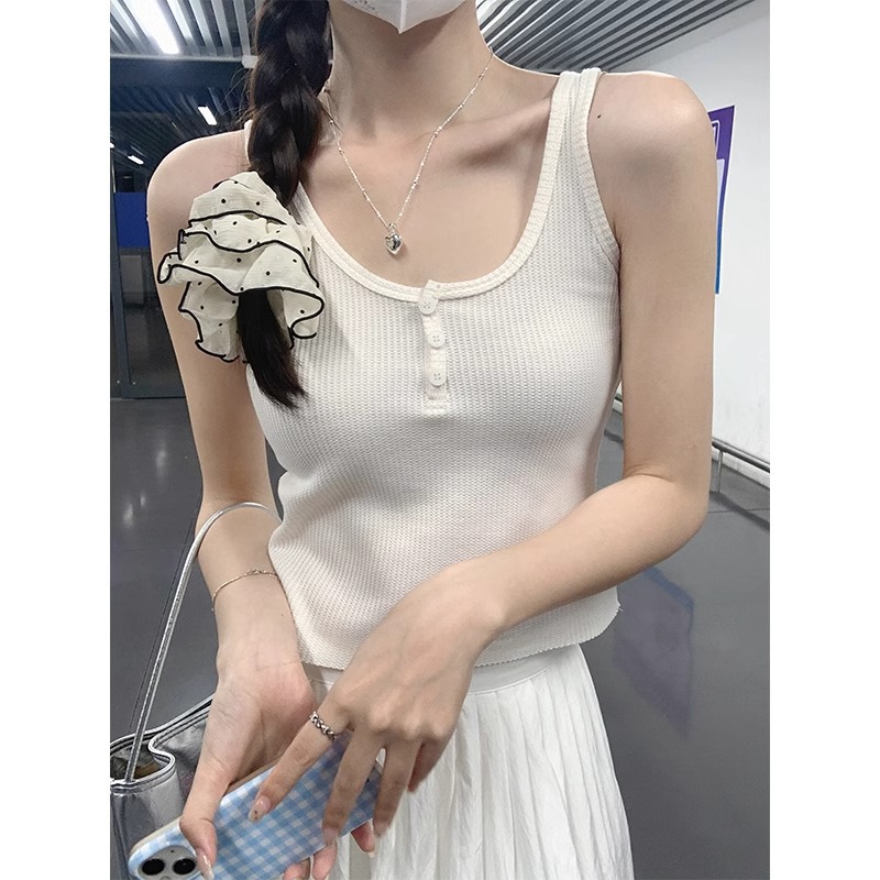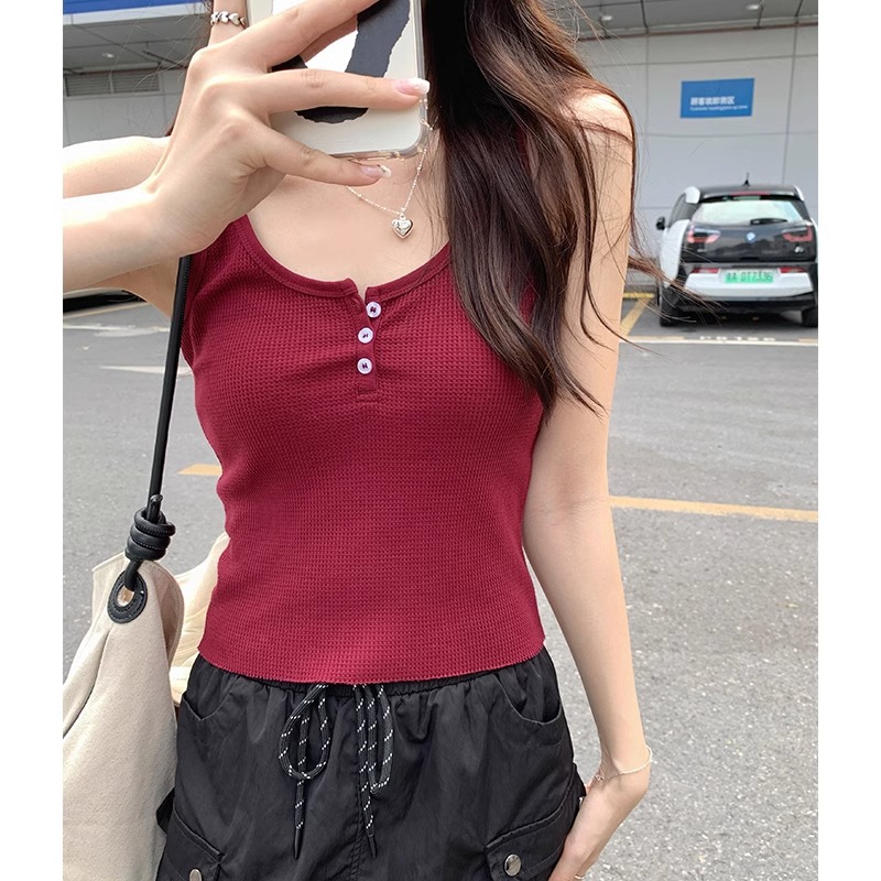 酒红色美式复古纯欲小吊带背心女春夏设计感华夫格大领口纽扣上衣