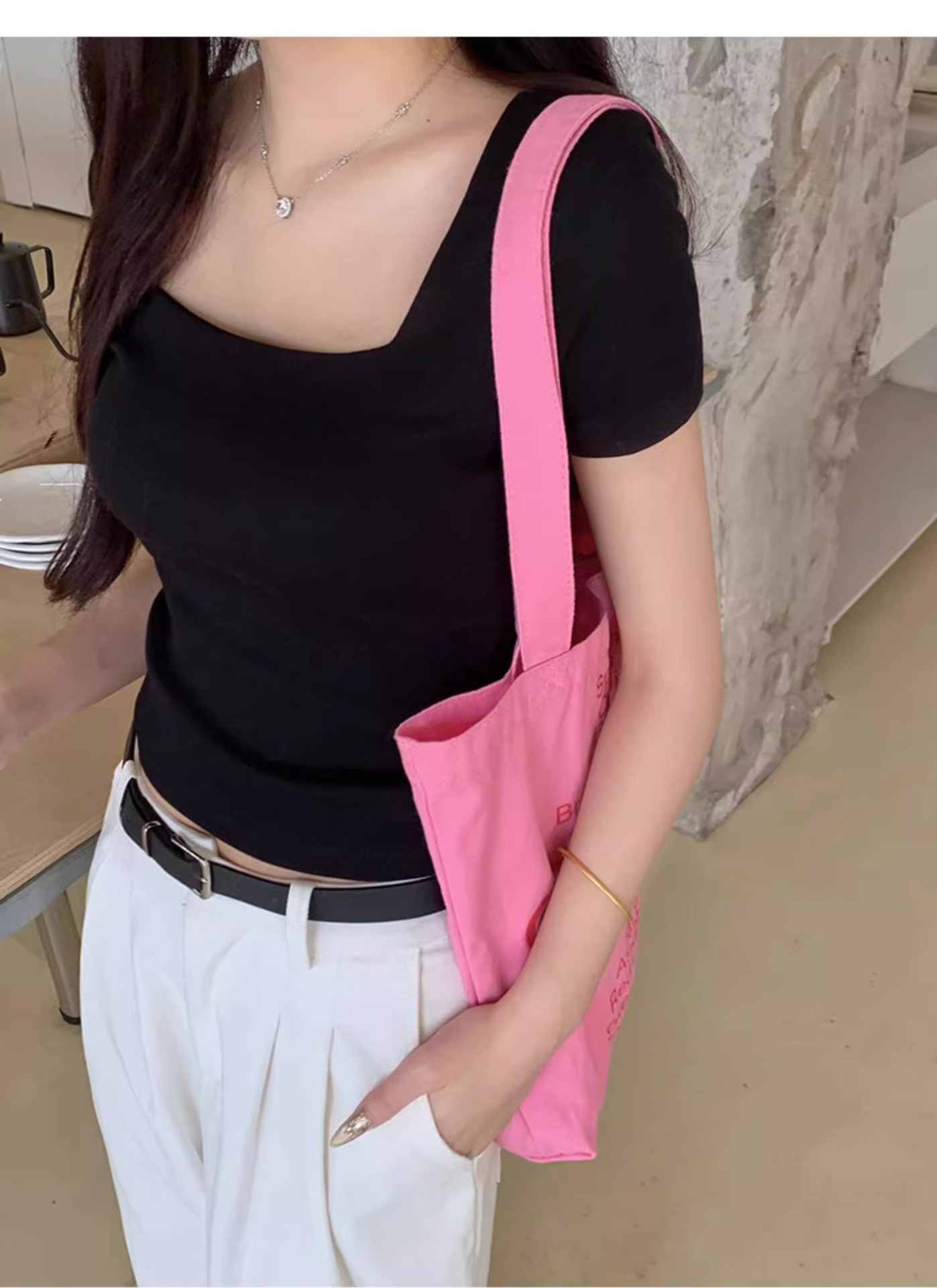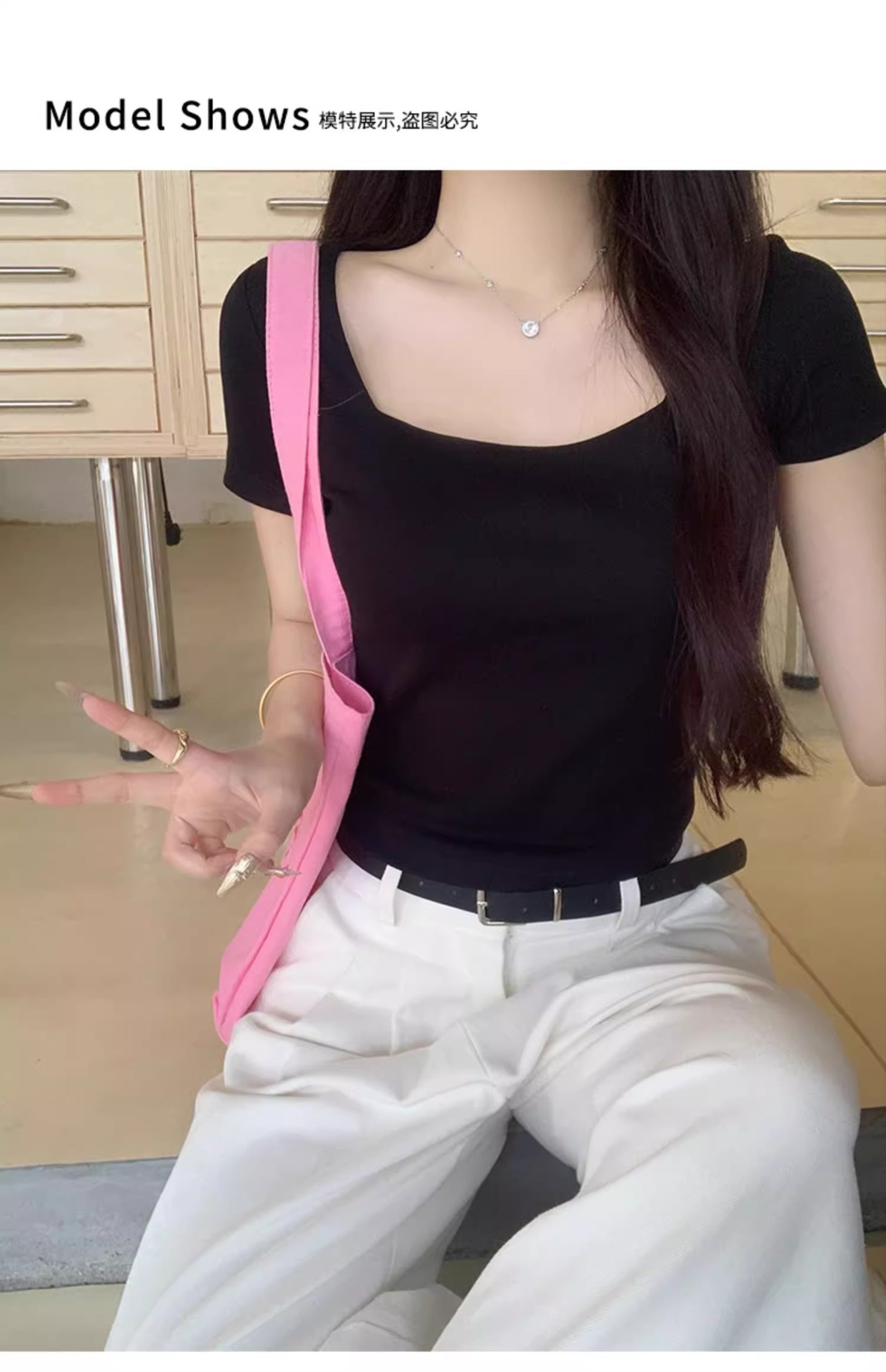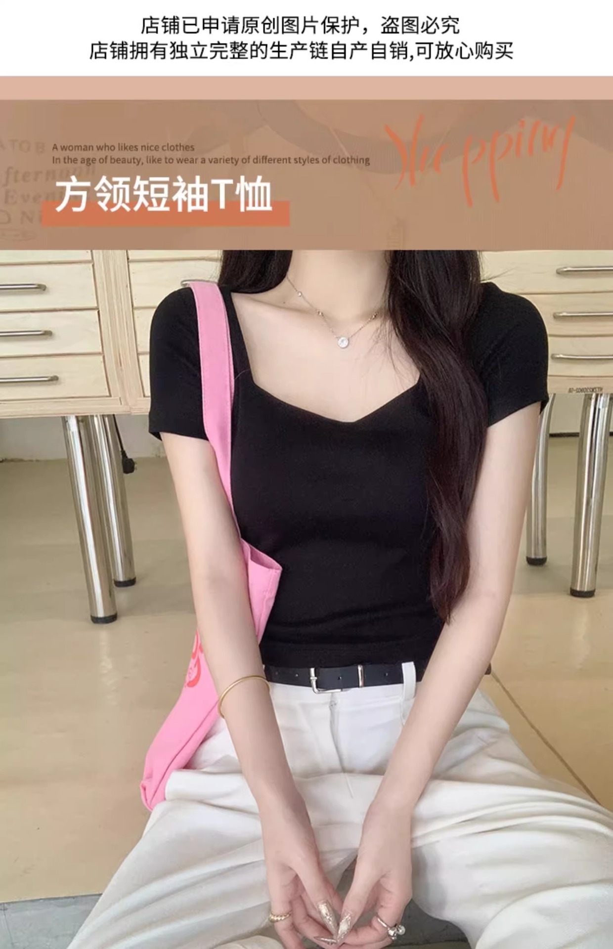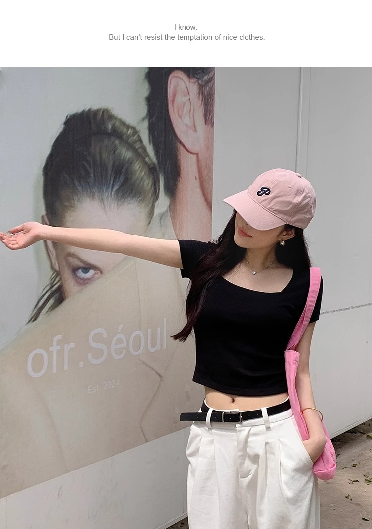 黑色性感低领露锁骨短袖T恤女夏修身显瘦小个子短款通勤别致上衣