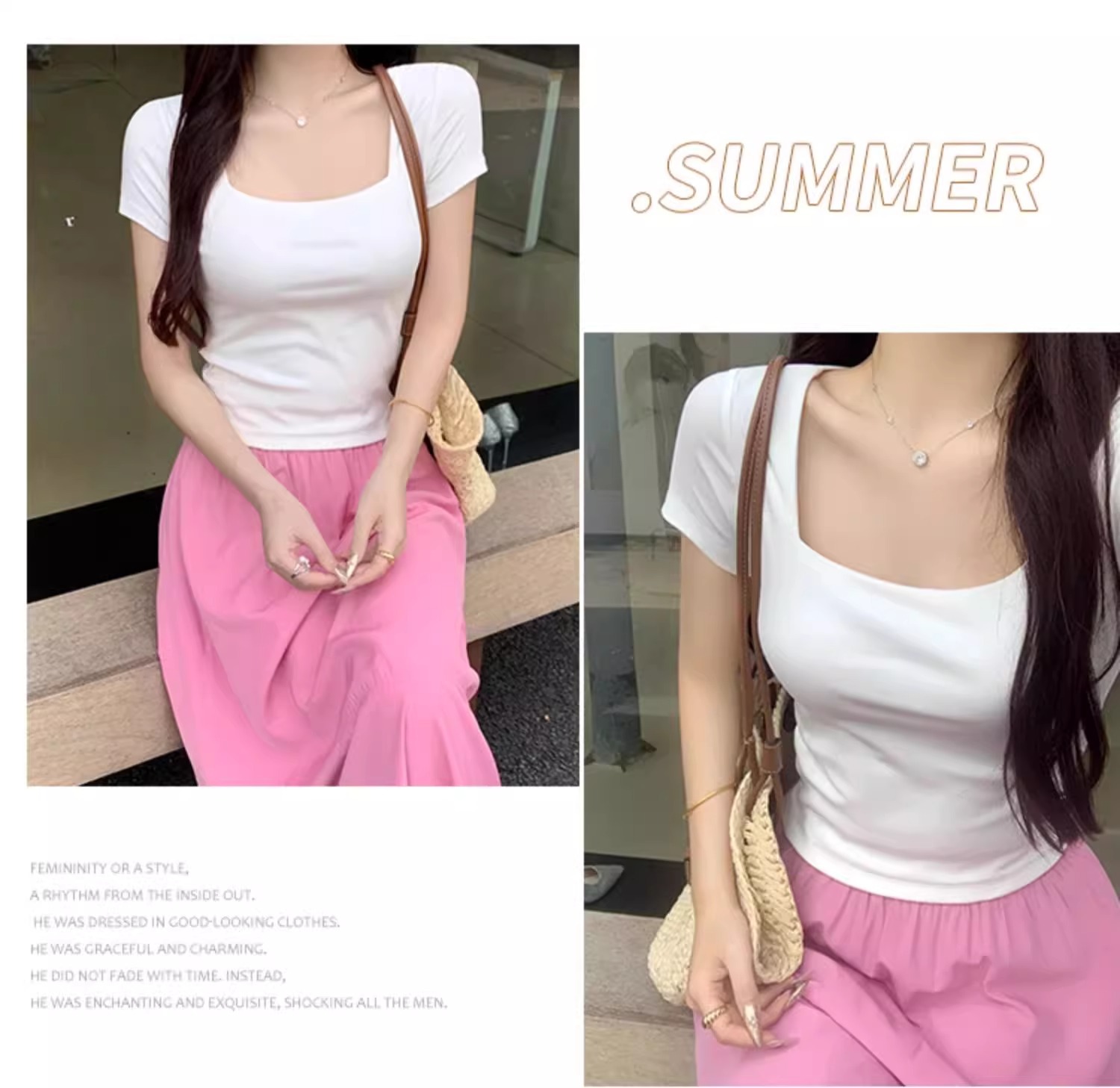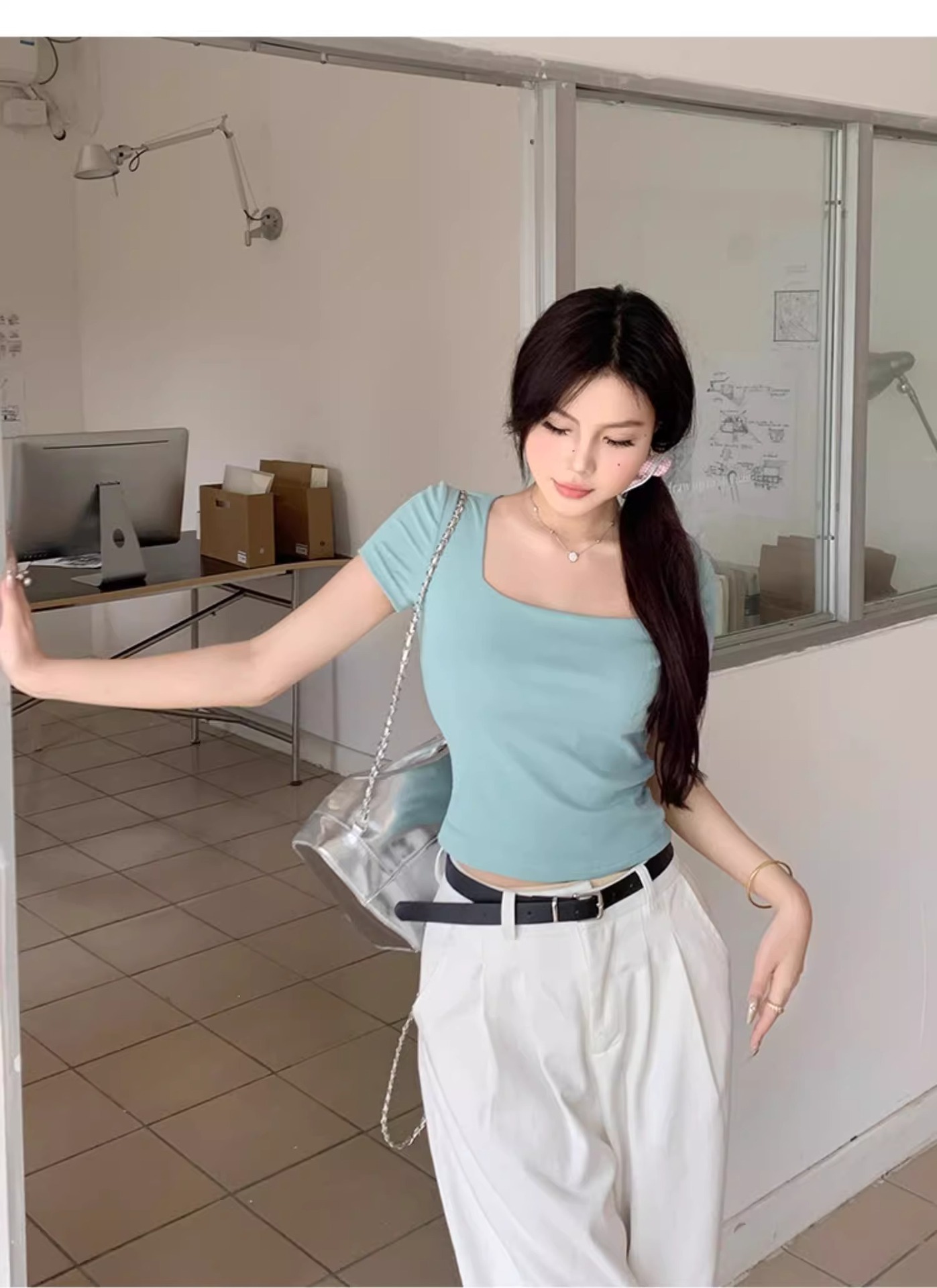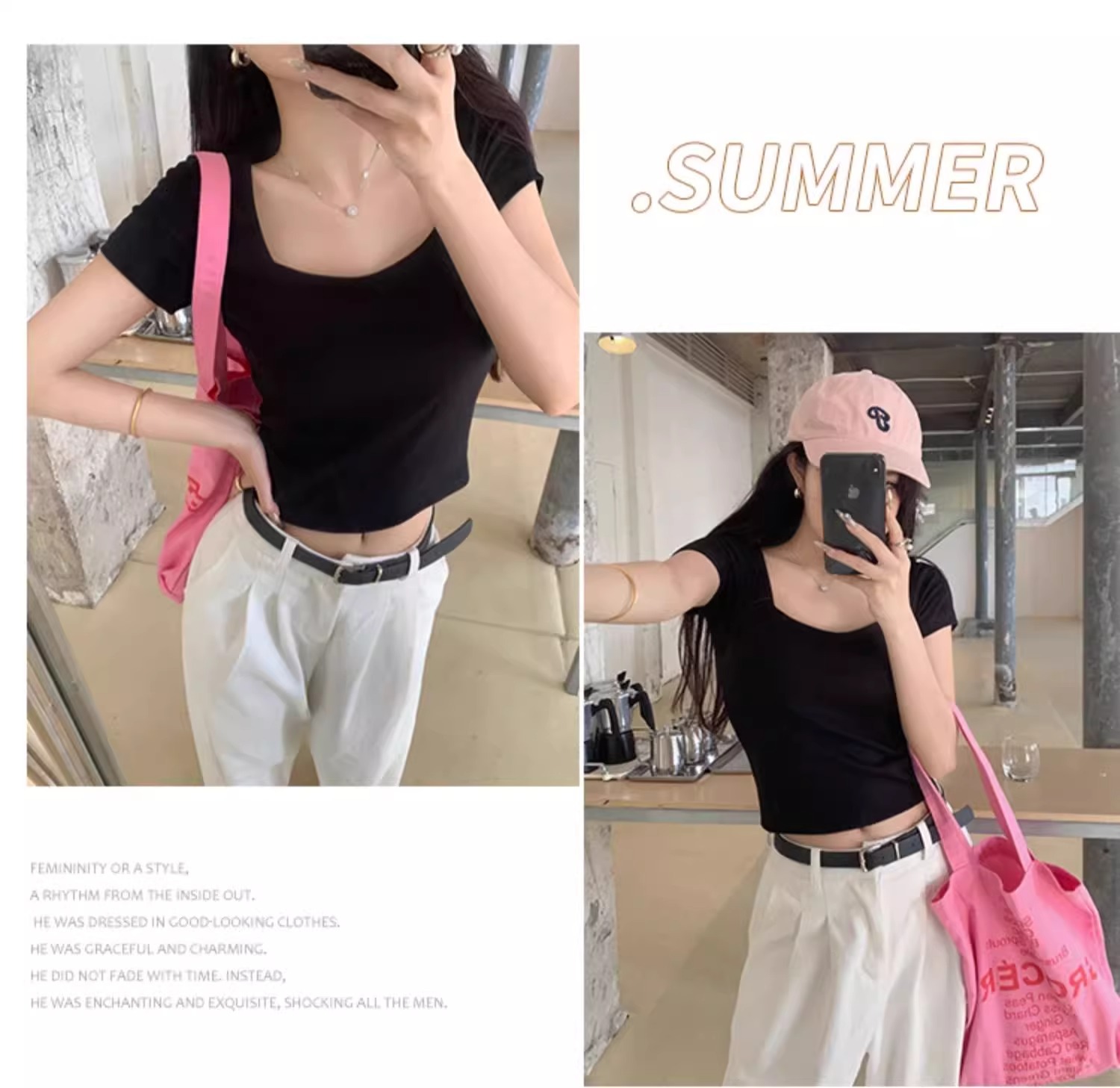 黑色性感低领露锁骨短袖T恤女夏修身显瘦小个子短款通勤别致上衣