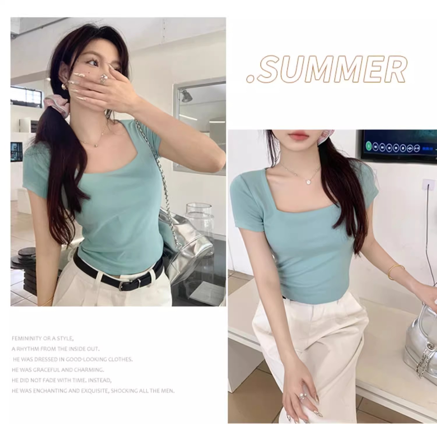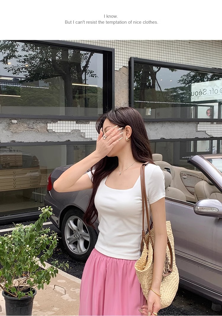 欧货冰丝针织衫女短袖薄款夏季洋气纯色修身锁骨短款上衣打底衫潮