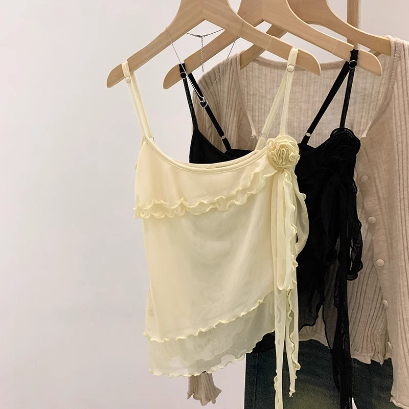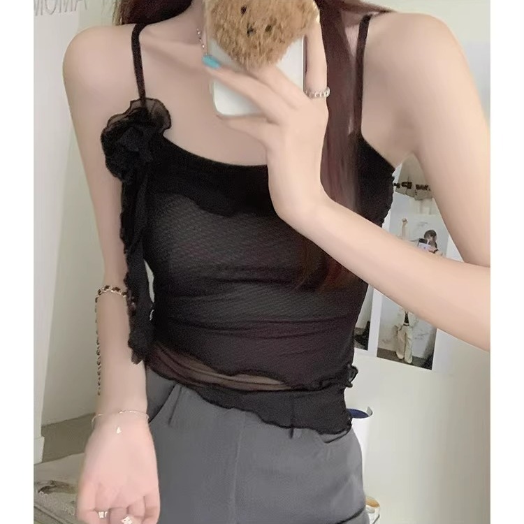 美式复古网纱微透性感小吊带立体花朵纯欲收腰夏季露肩上衣女