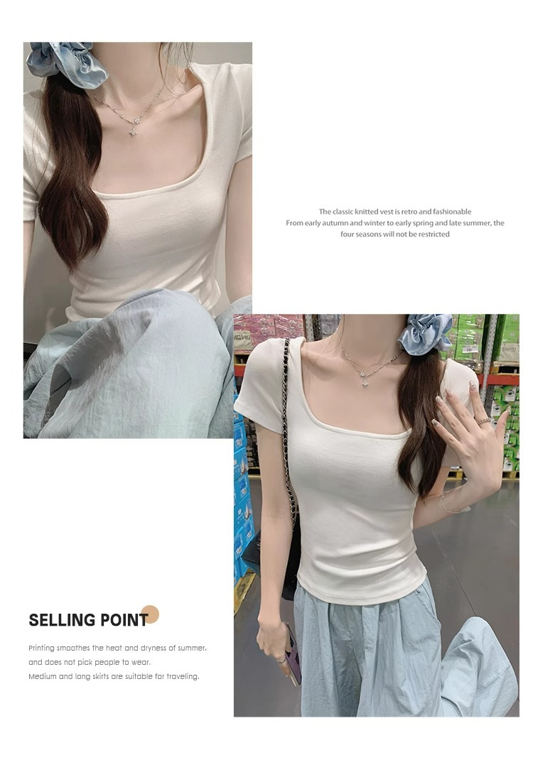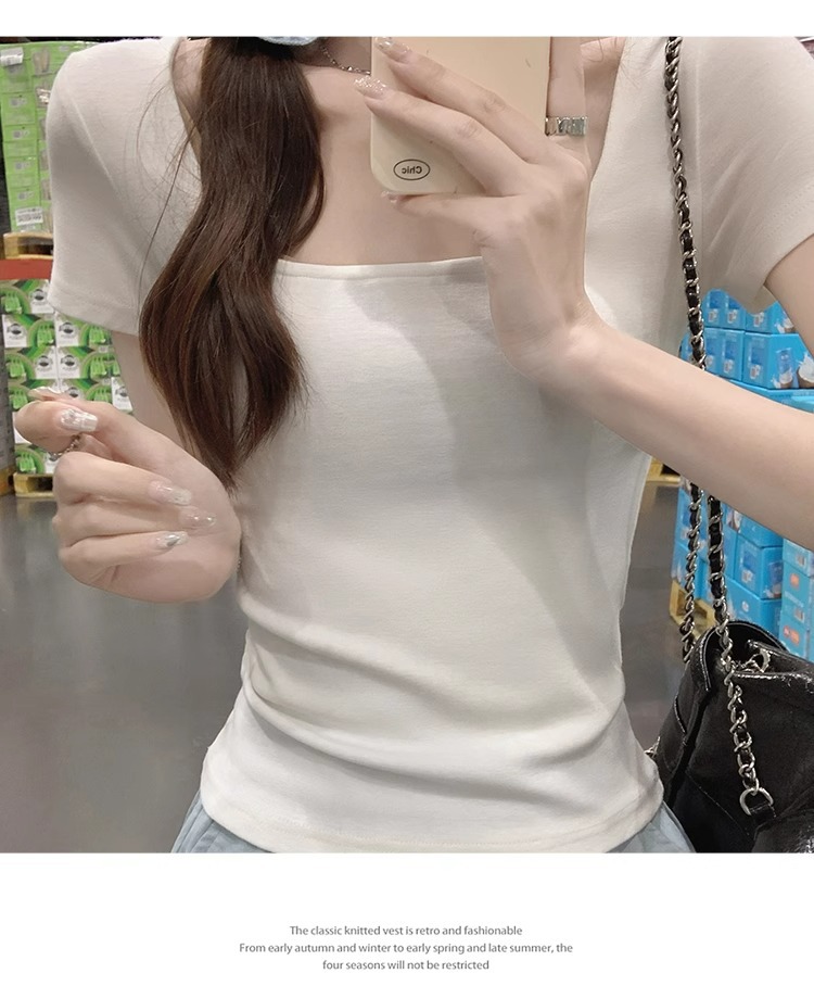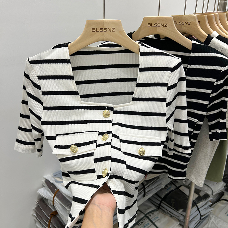 美式甜辣条纹短袖t恤女开衫夏季修身别致垫肩方领锁骨上衣女
