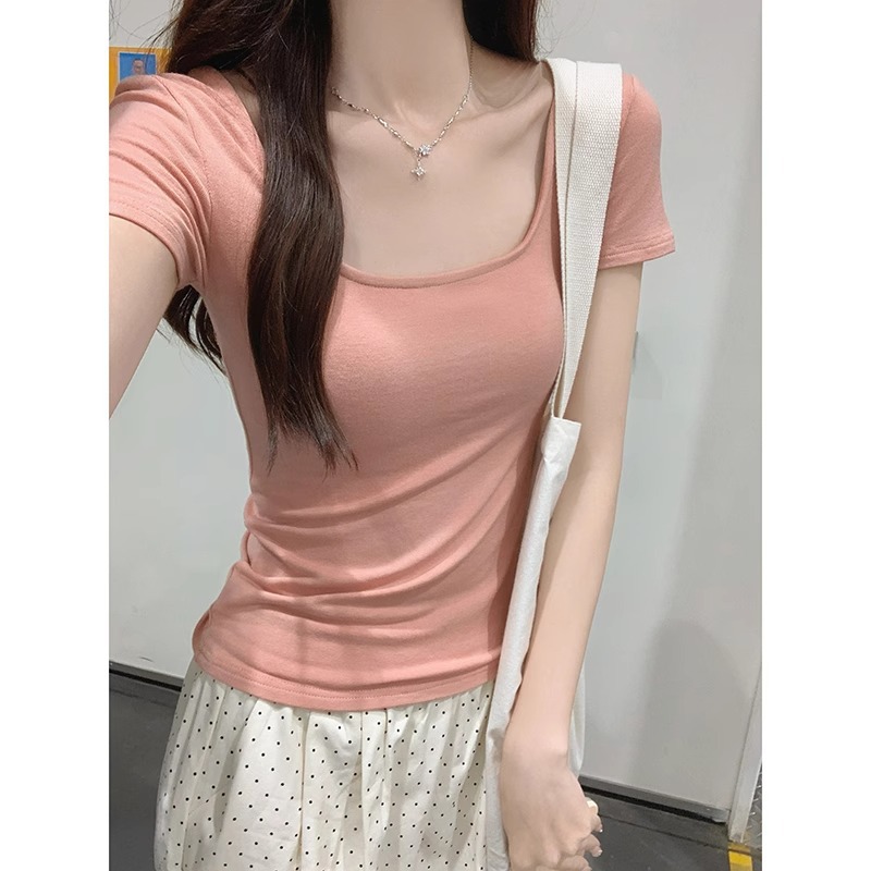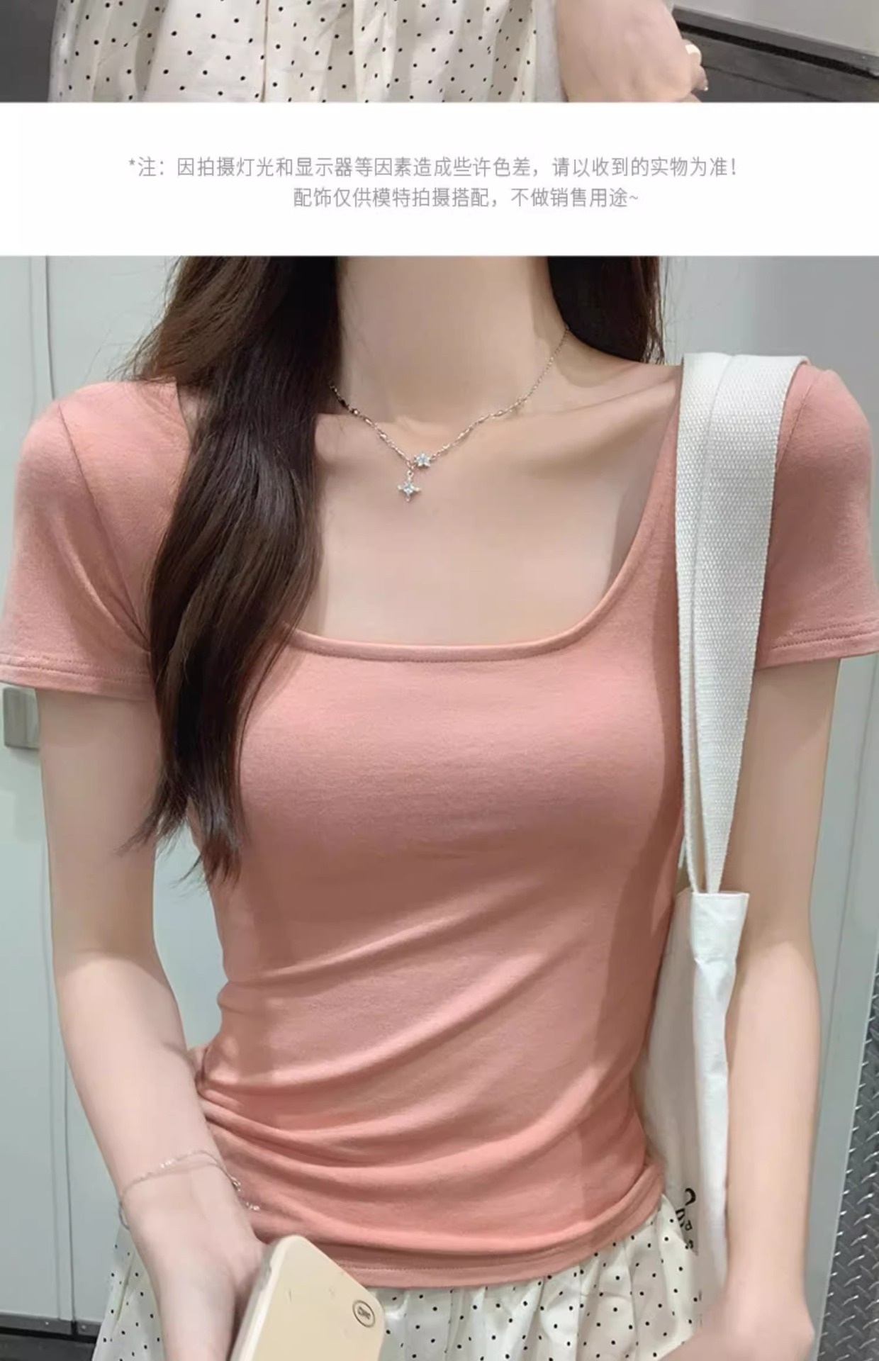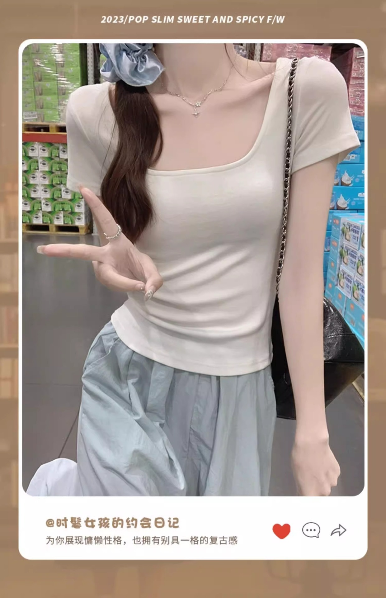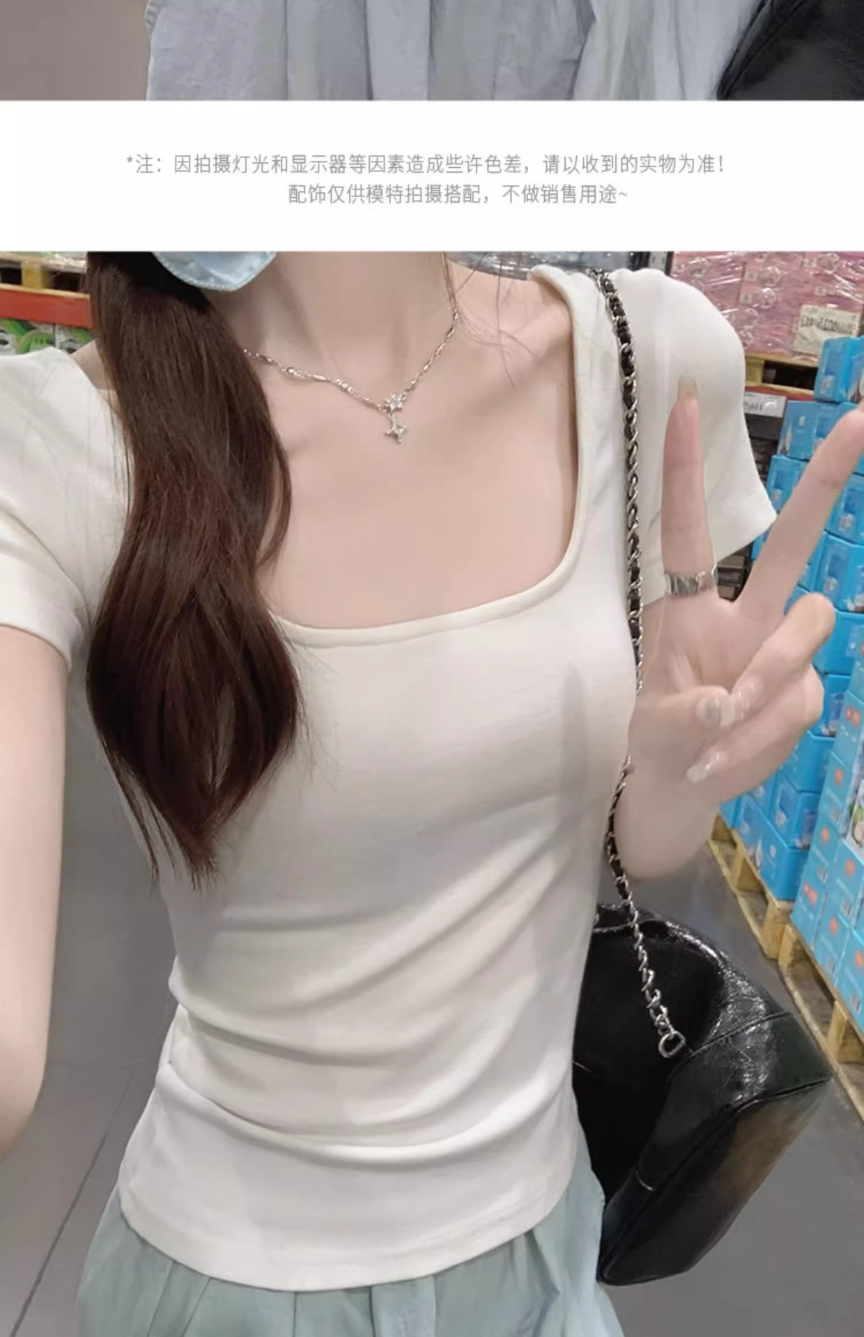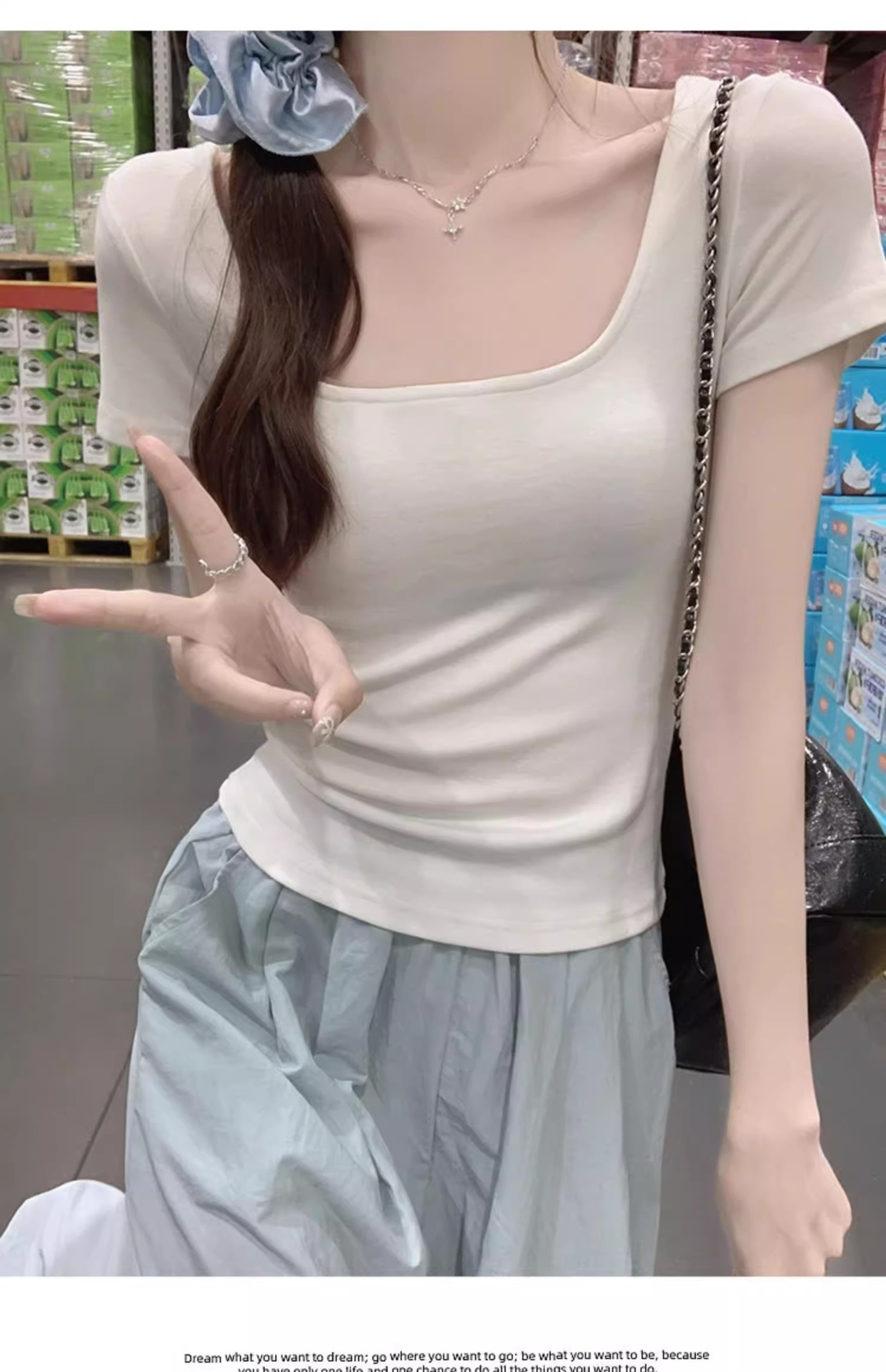 韩版夏季多巴胺大U领露锁骨显白上衣短款甜妹短袖修身小T恤女