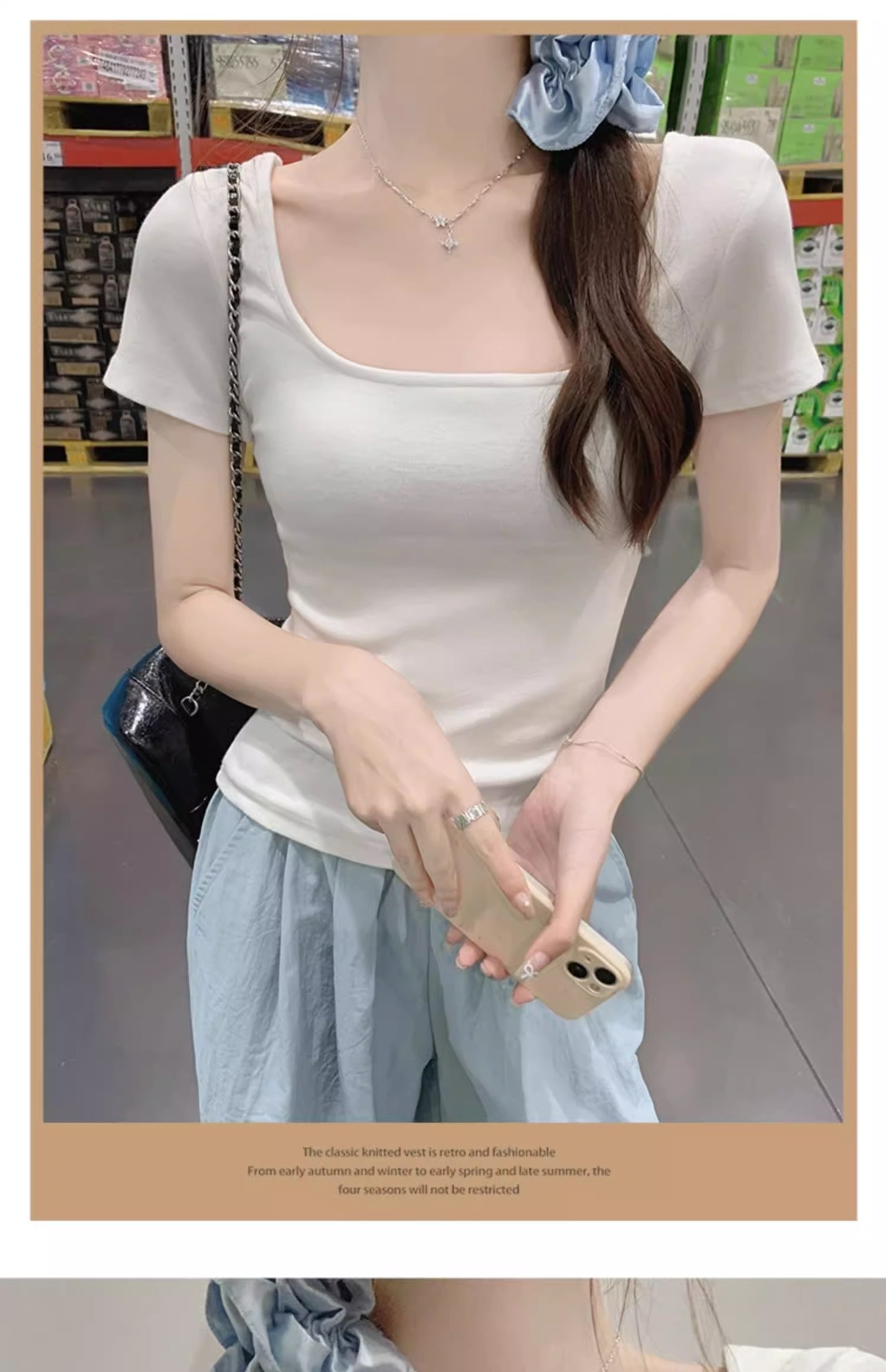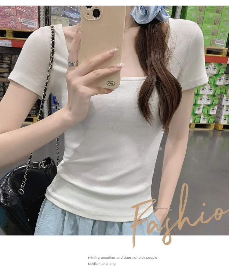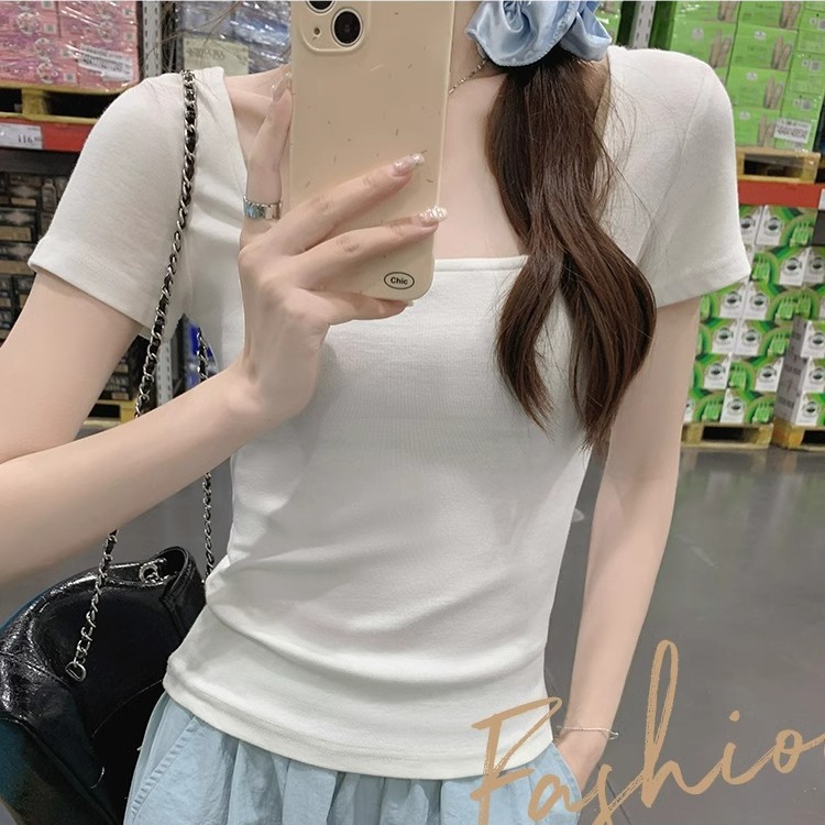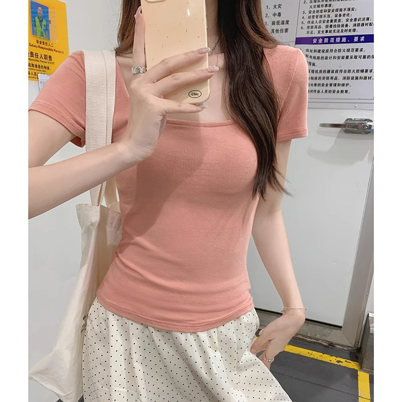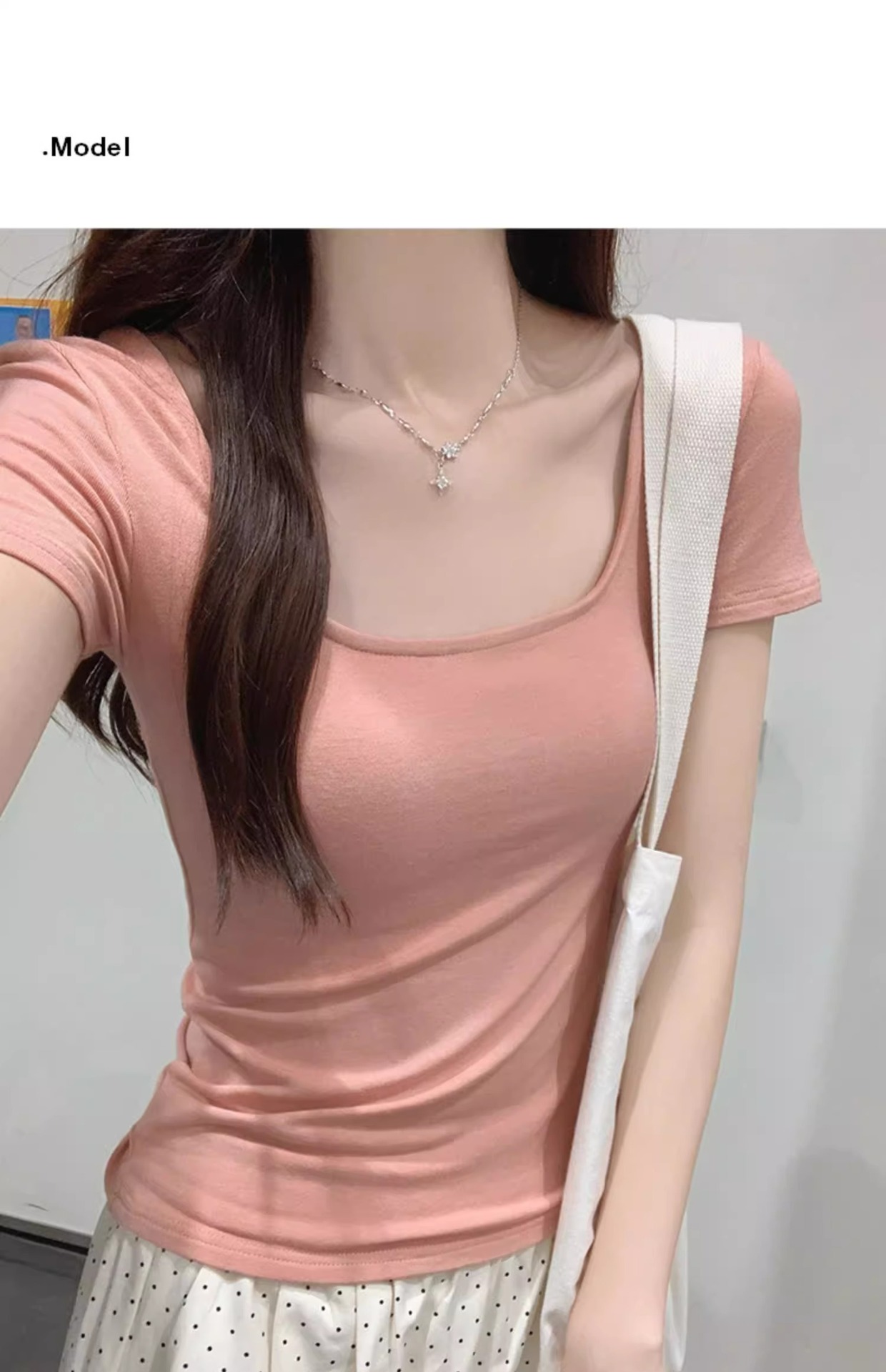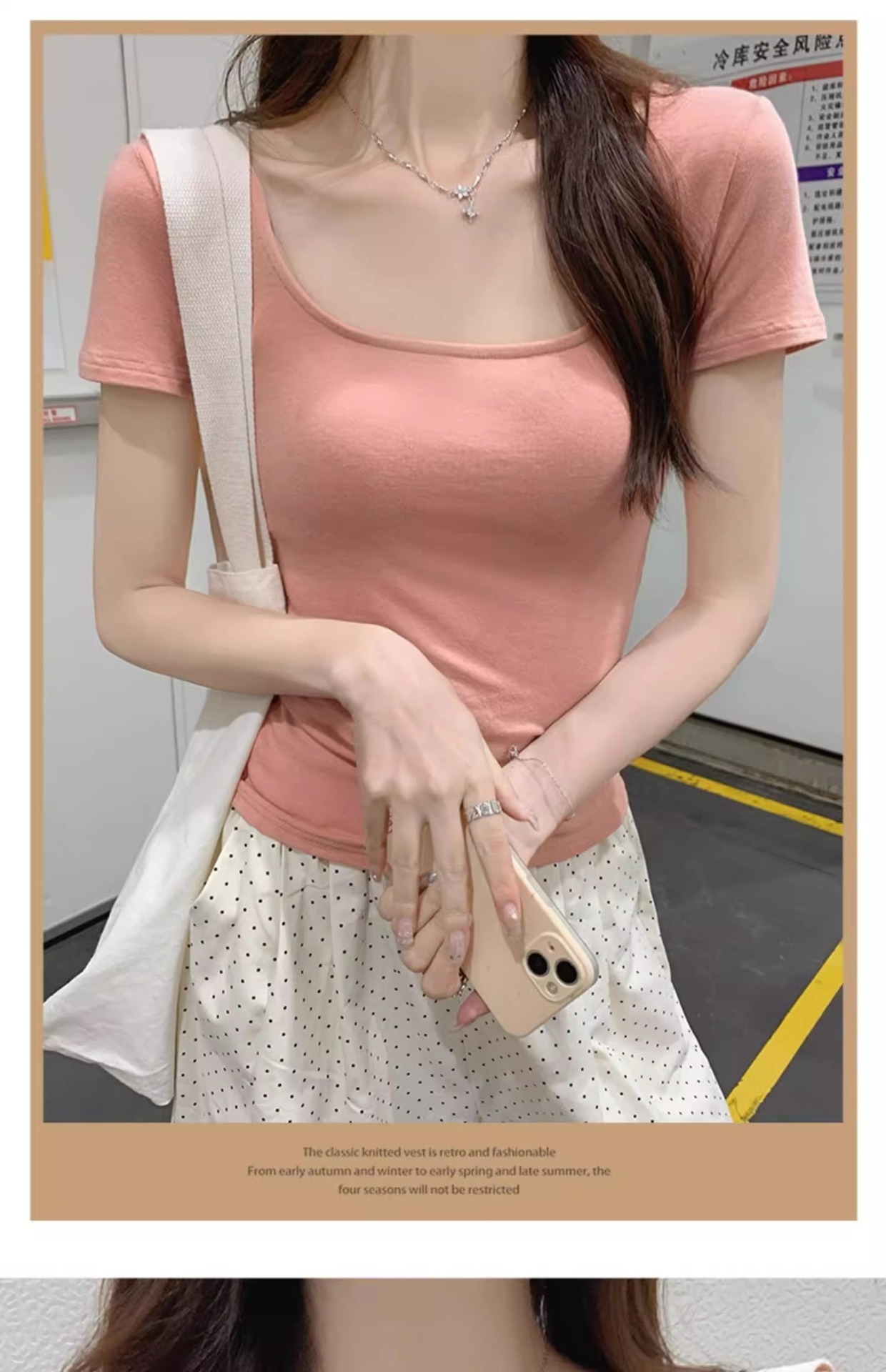 韩版夏季多巴胺大U领露锁骨显白上衣短款甜妹短袖修身小T恤女