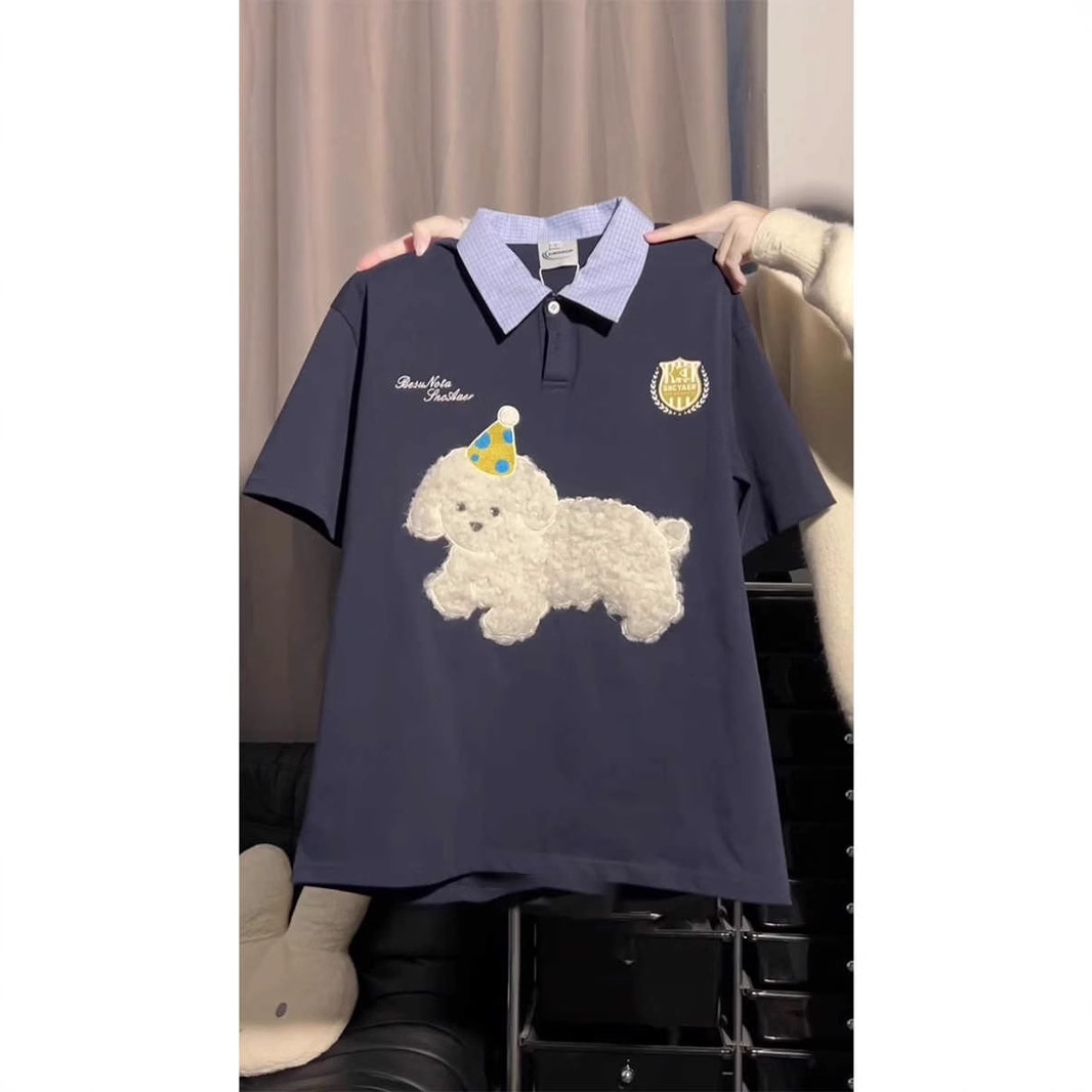 美式复古学院风刺绣狗狗短袖t恤女夏季宽松慵懒风百搭情侣上衣ins