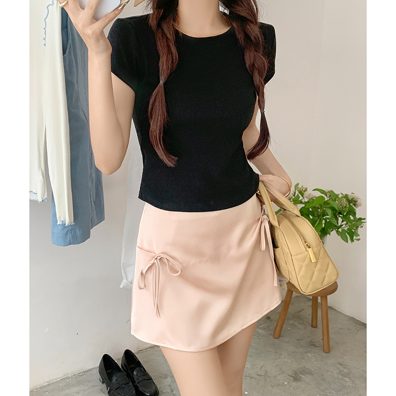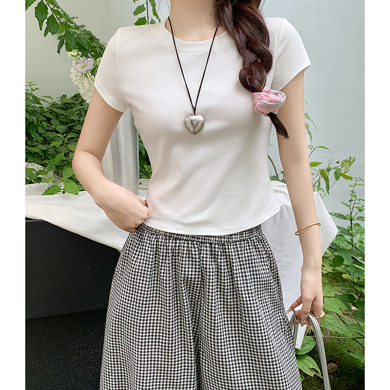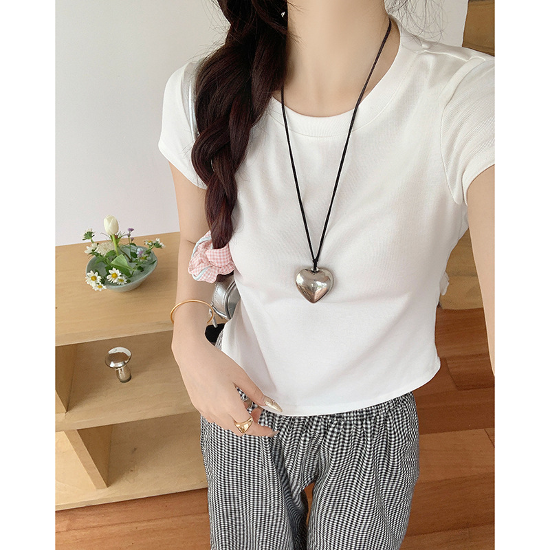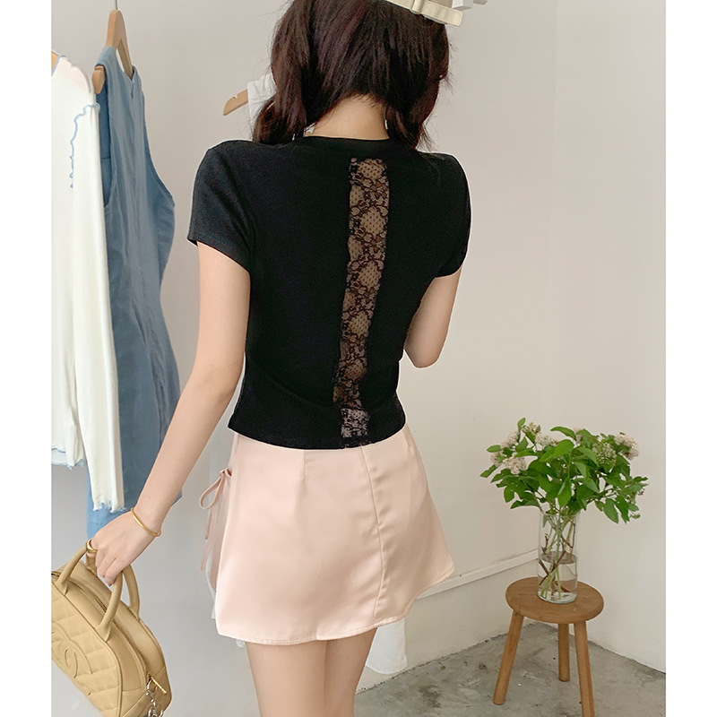 白色蕾丝拼接修身短款夏季上衣背部镂空显瘦正肩圆领露脐短袖T恤