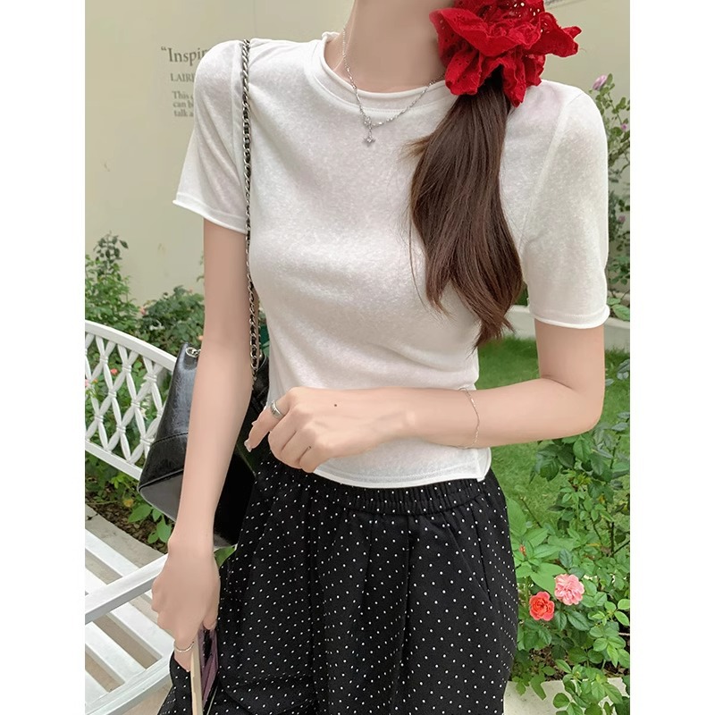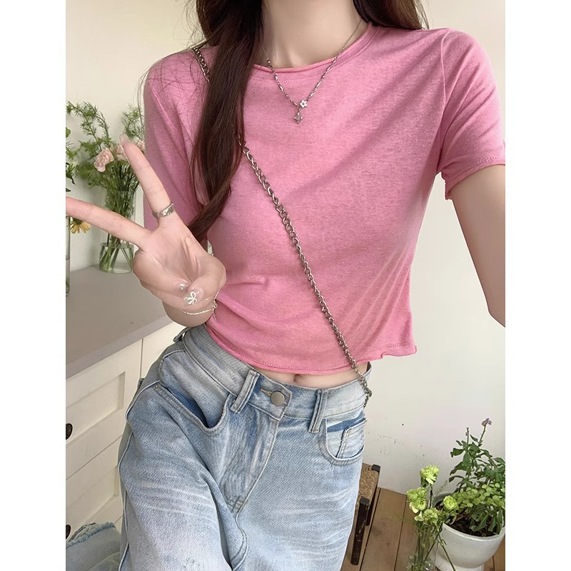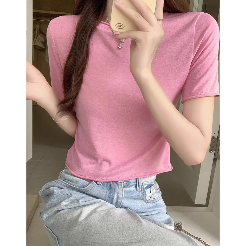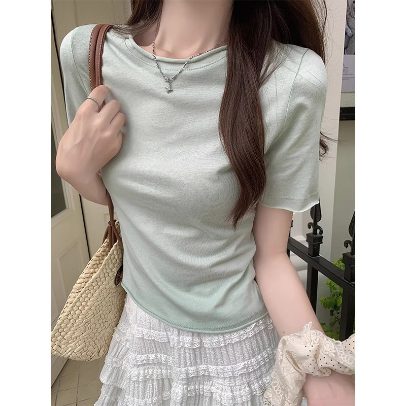 多巴胺圆领正肩短袖t恤女设计感小众休闲百搭透气修身短上衣夏季