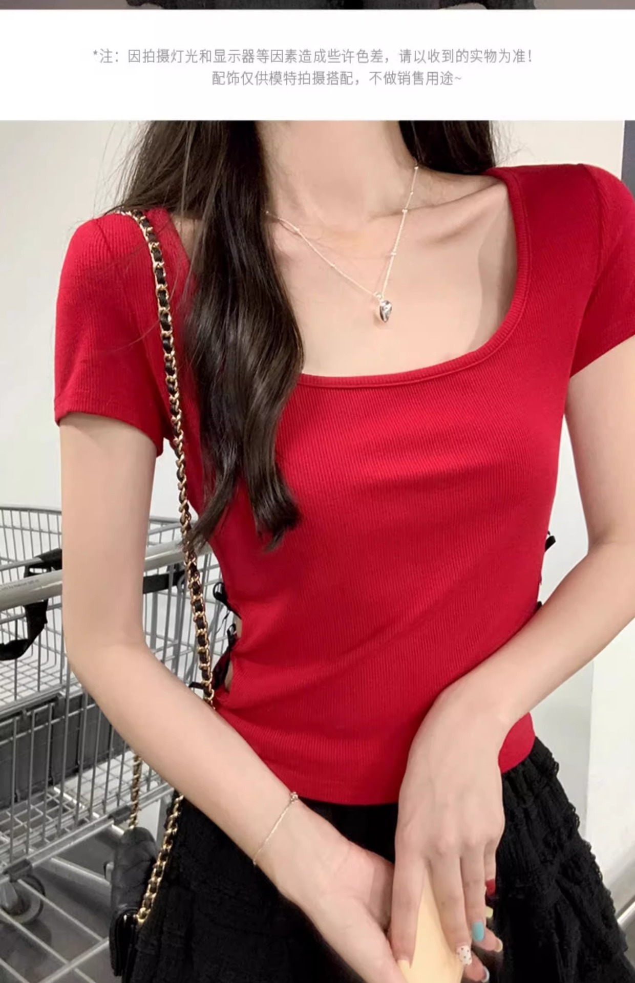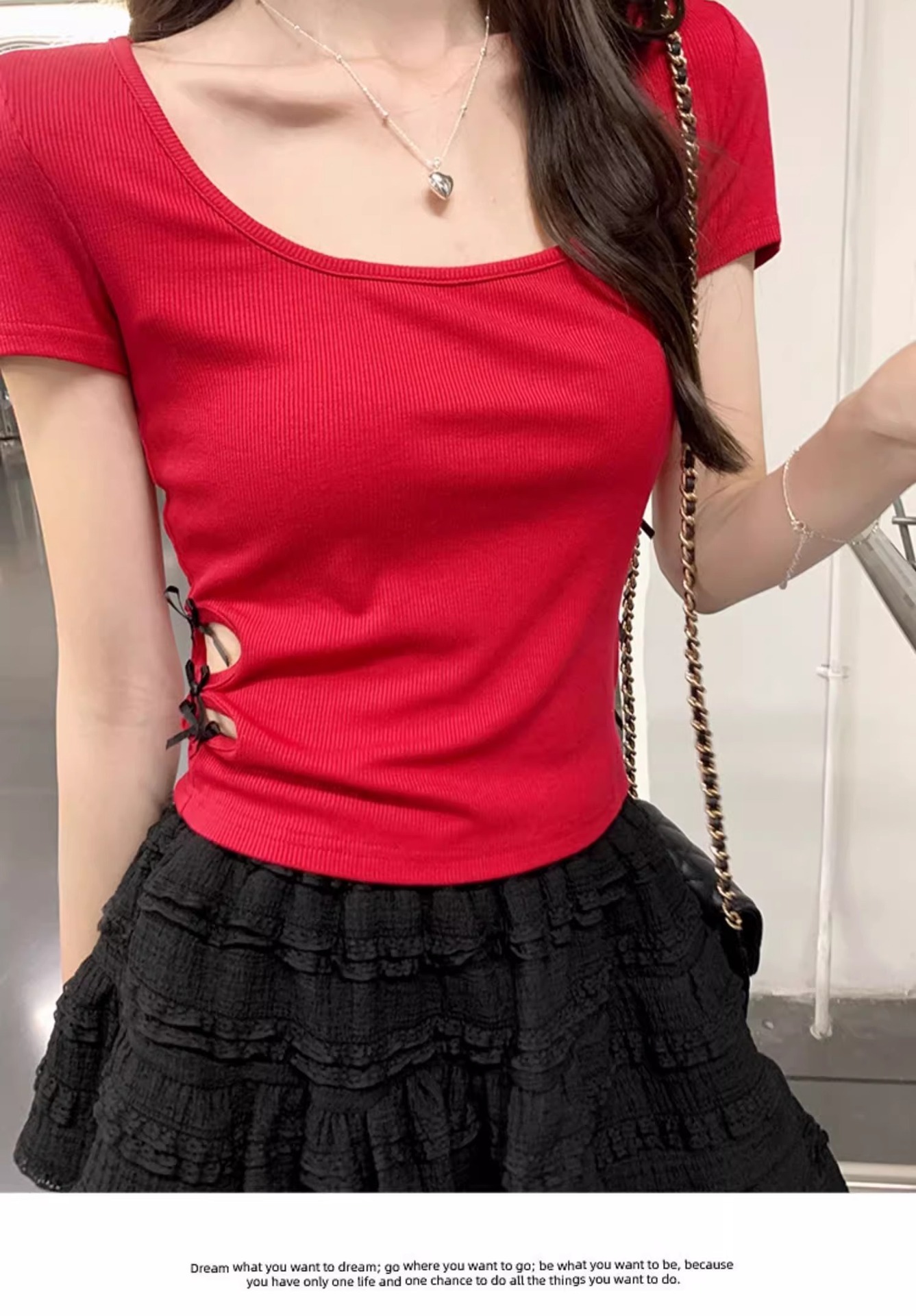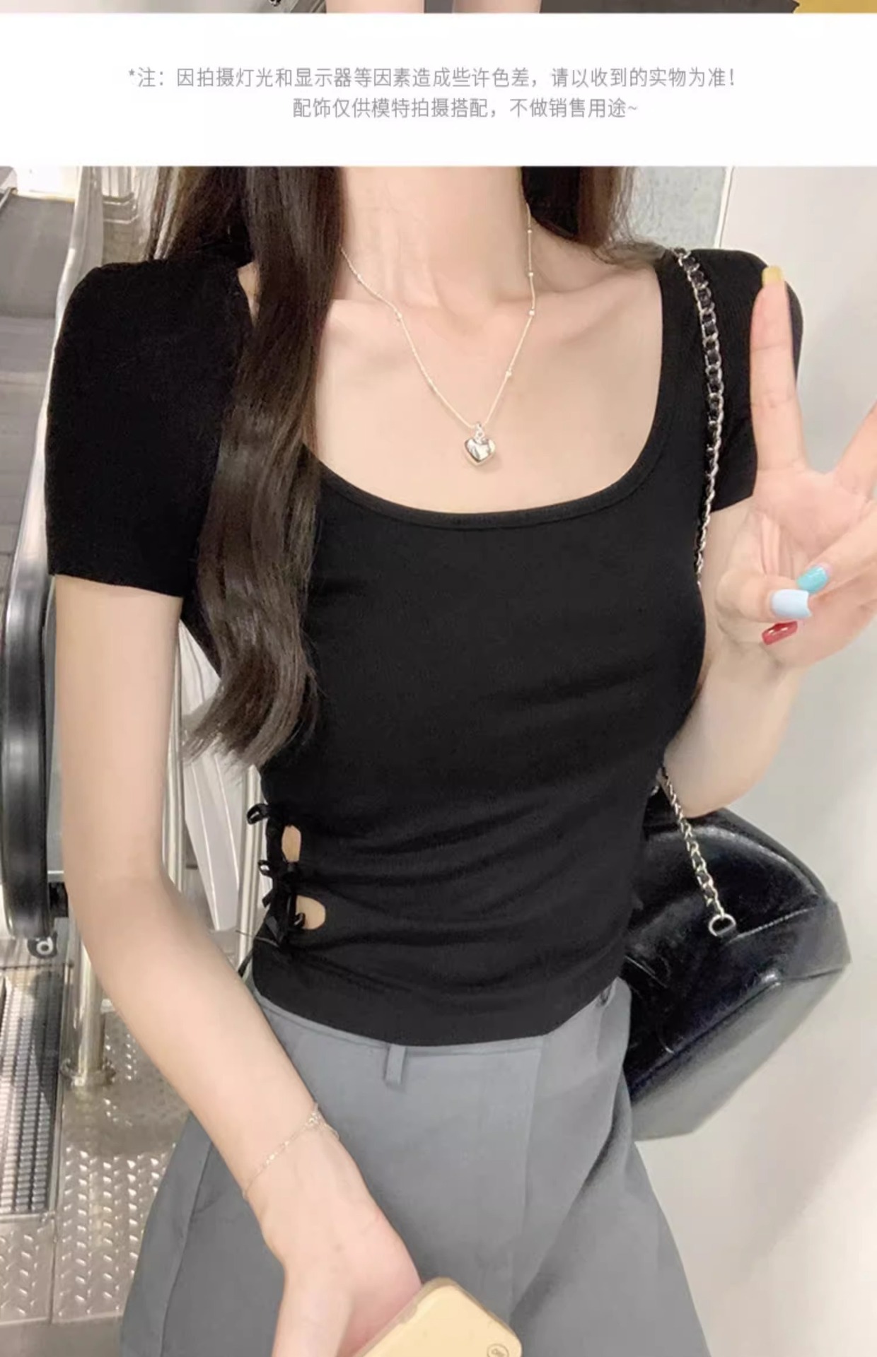黑色新款方领露锁骨修身纯欲夏季短袖T恤蝴蝶结腰部镂空短款上衣