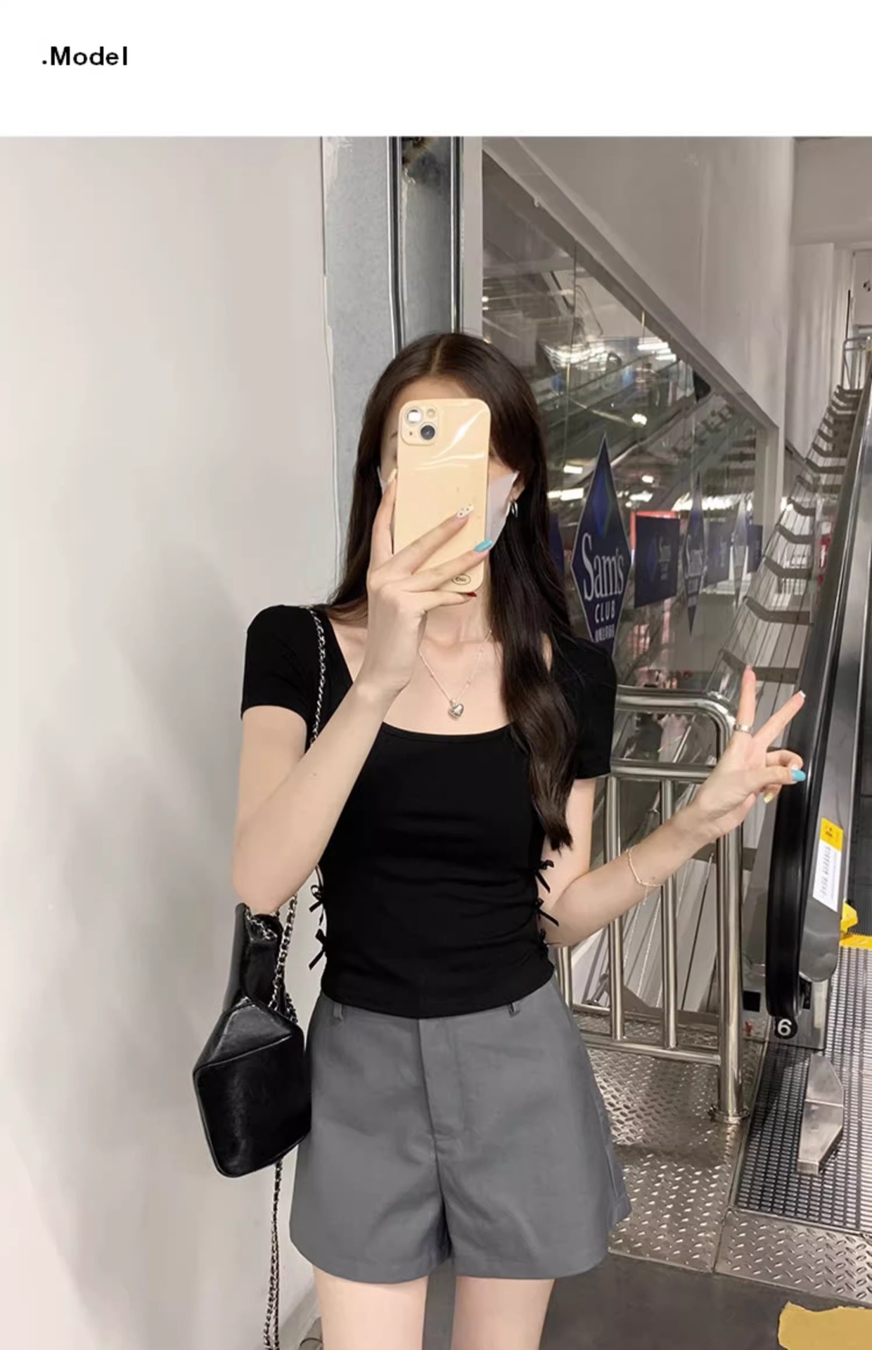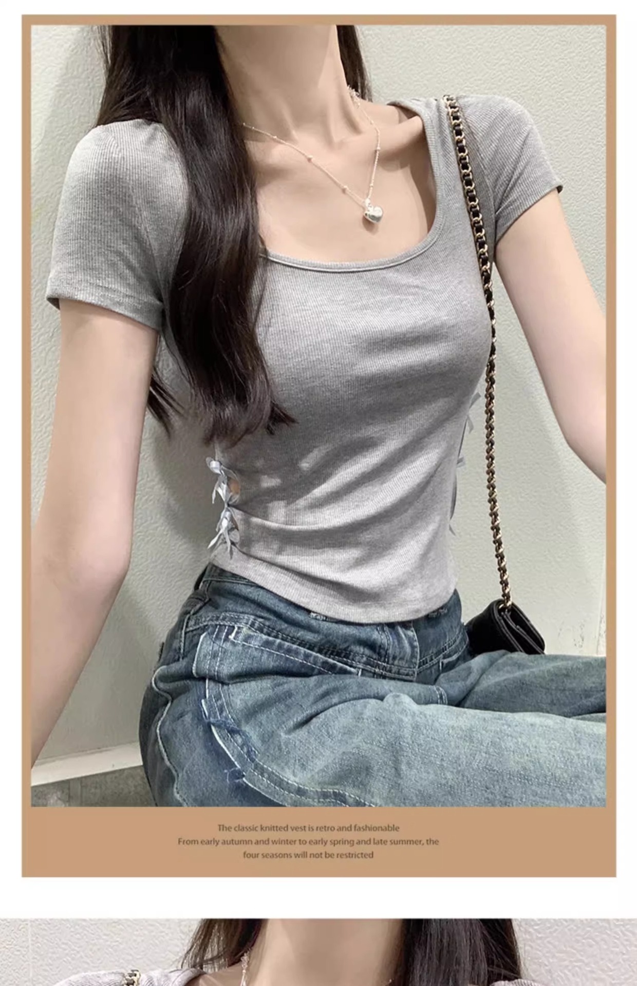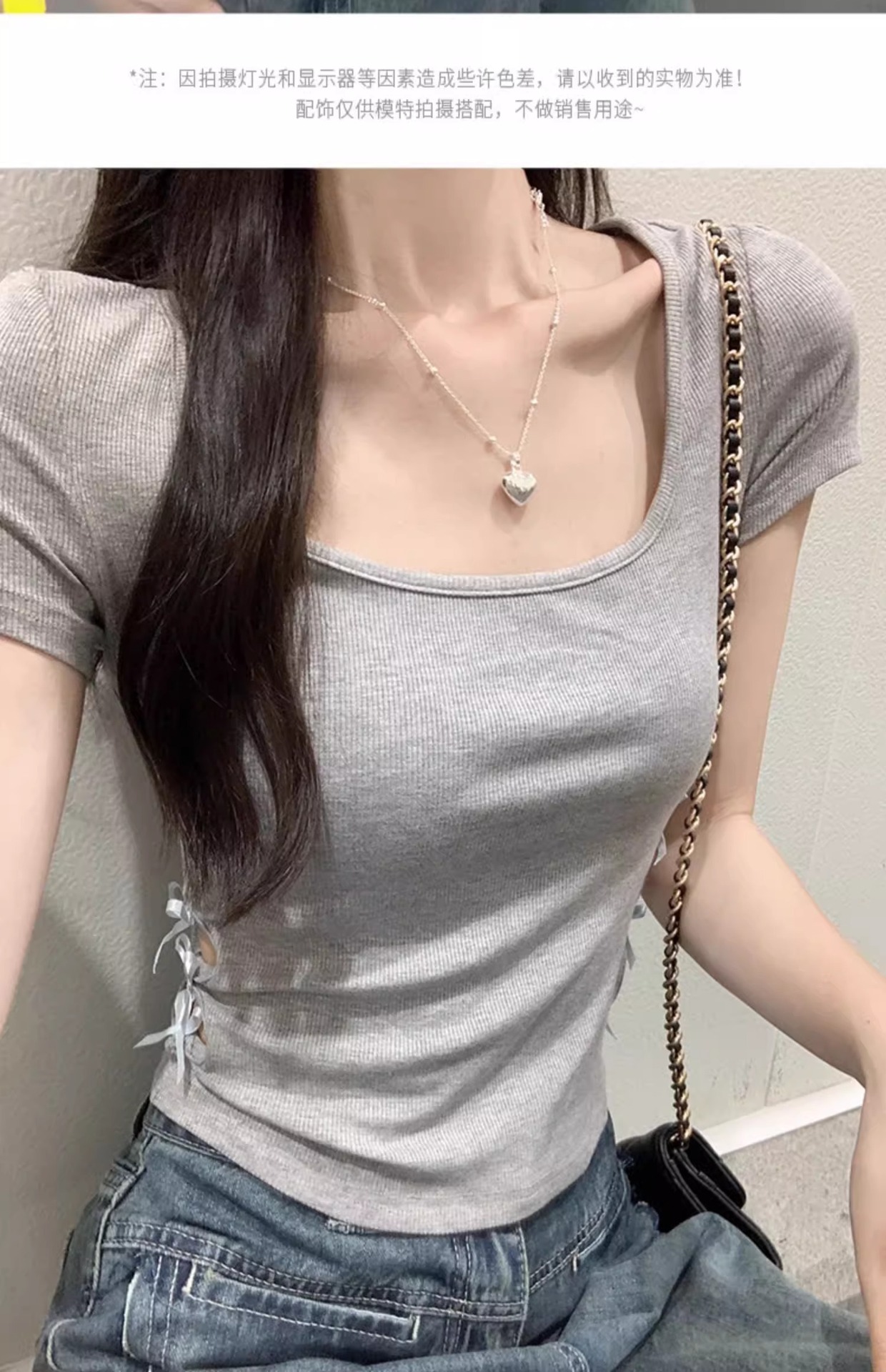 黑色新款方领露锁骨修身纯欲夏季短袖T恤蝴蝶结腰部镂空短款上衣
