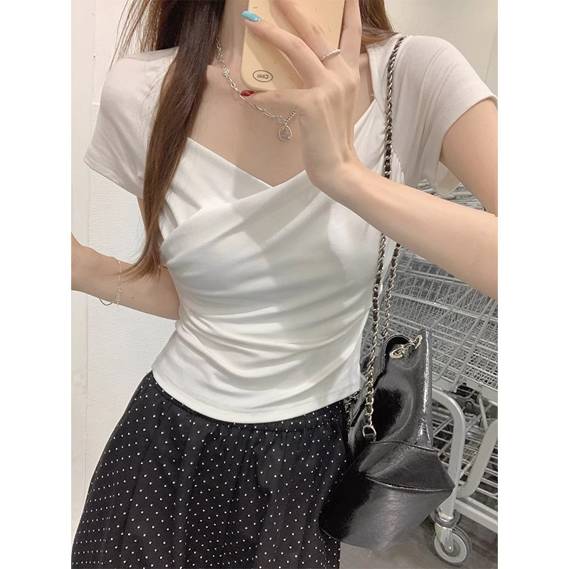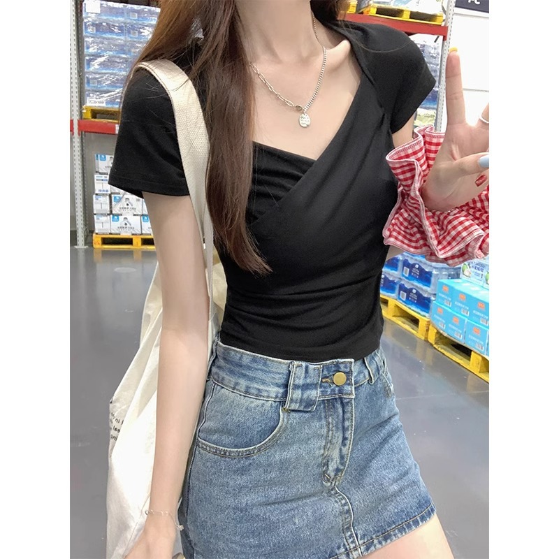 夏季新款韩系好搭设计感法式纯欲方领不规则修身显瘦短袖T恤