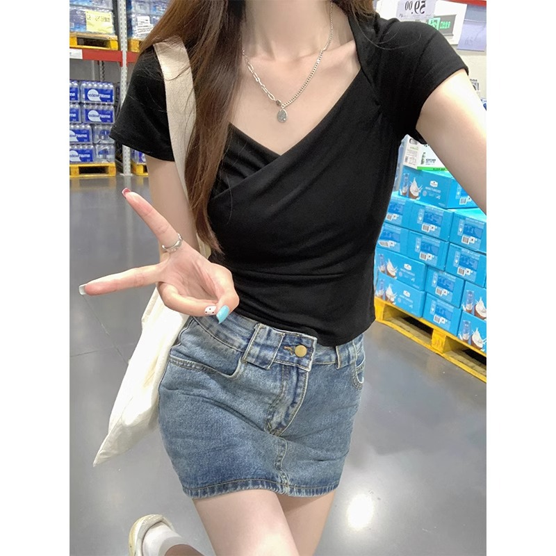 黑色纯欲辣妹交叉v领短袖T恤女夏新款气质修身显瘦锁骨短上衣