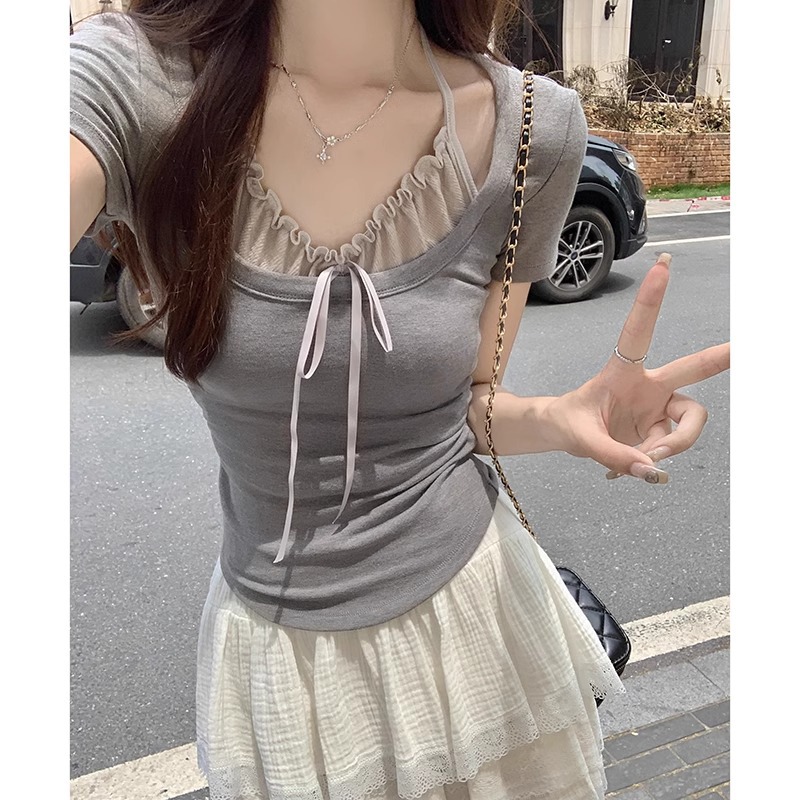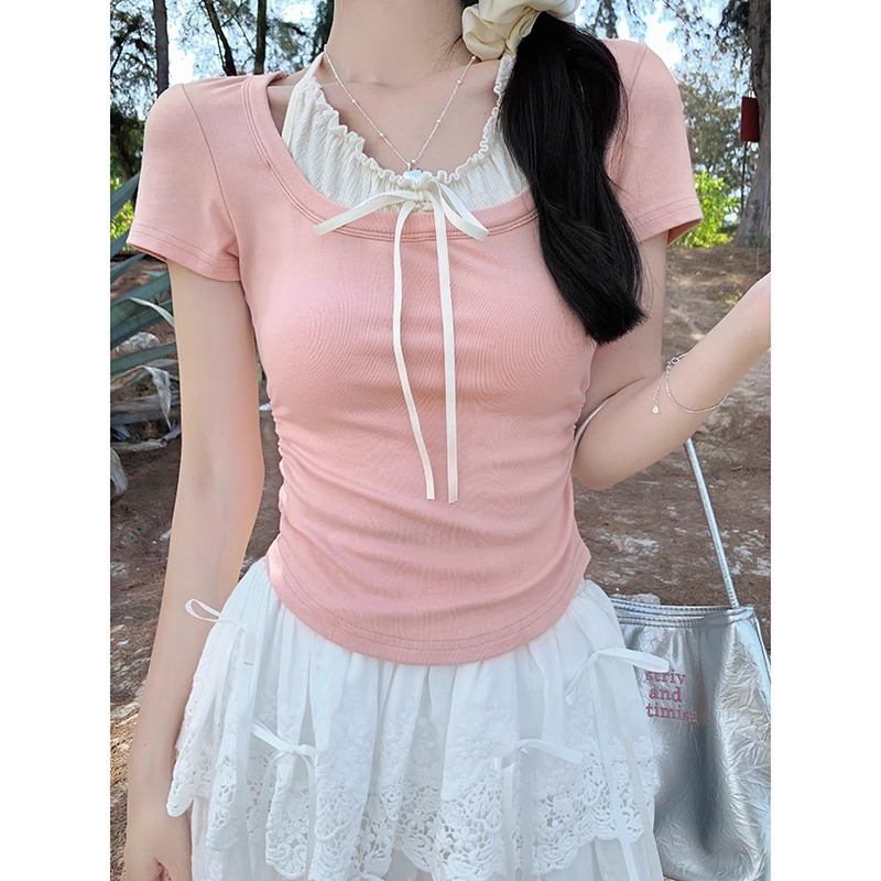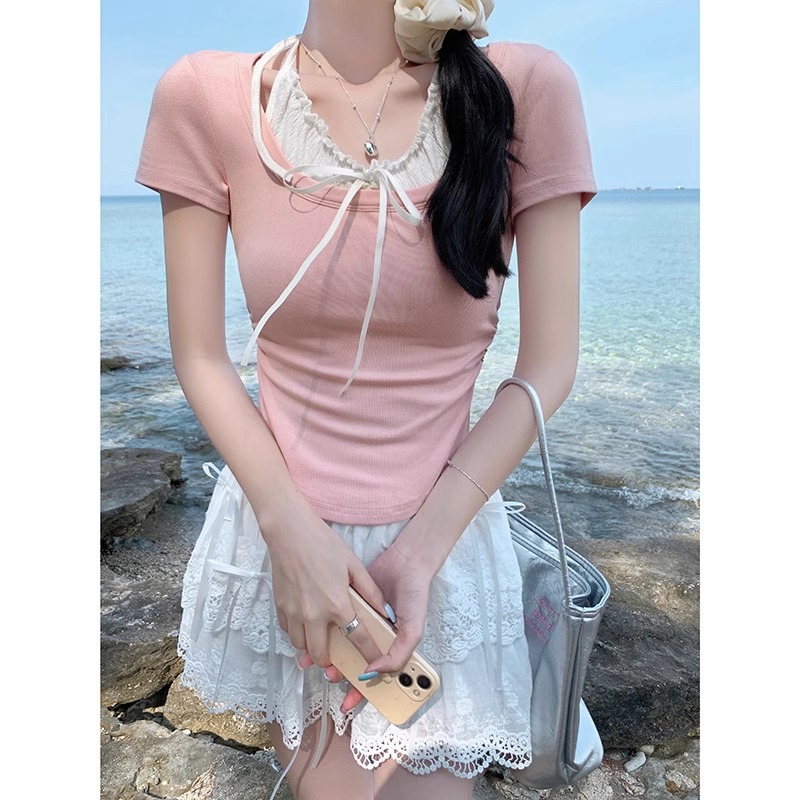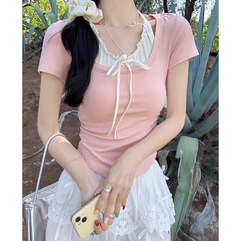 粉色纯欲系带挂脖假两件设计感上衣女蝴蝶结修身t恤正肩短袖夏季