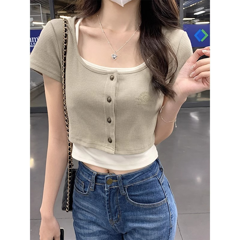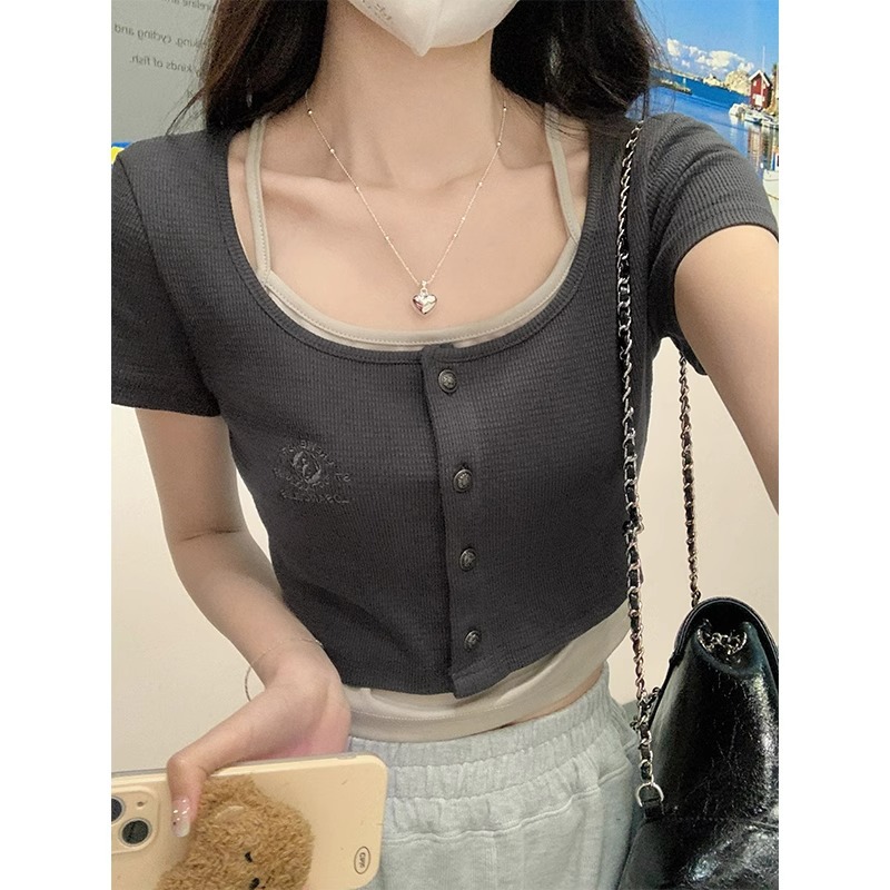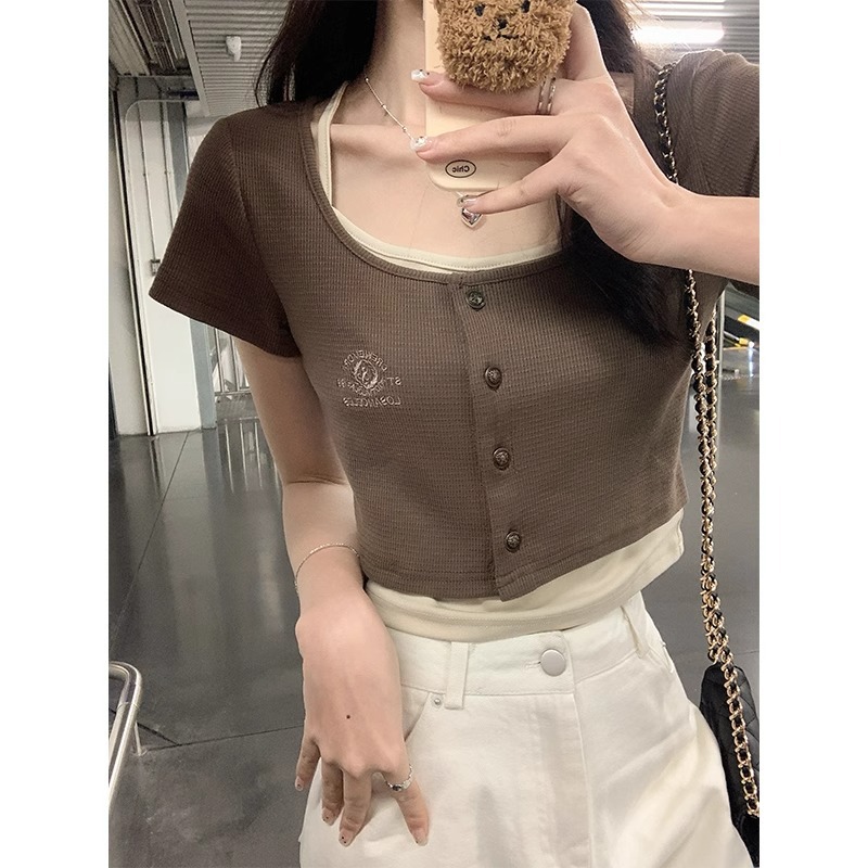 美式拼色正肩t恤女短袖春夏新款辣妹修身设计感假两件短上衣