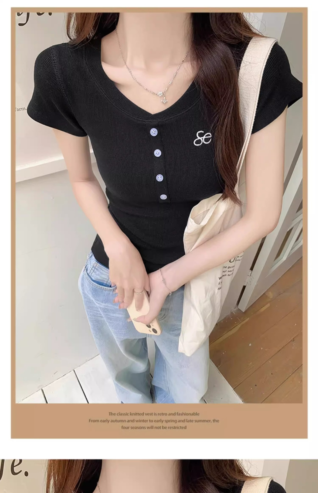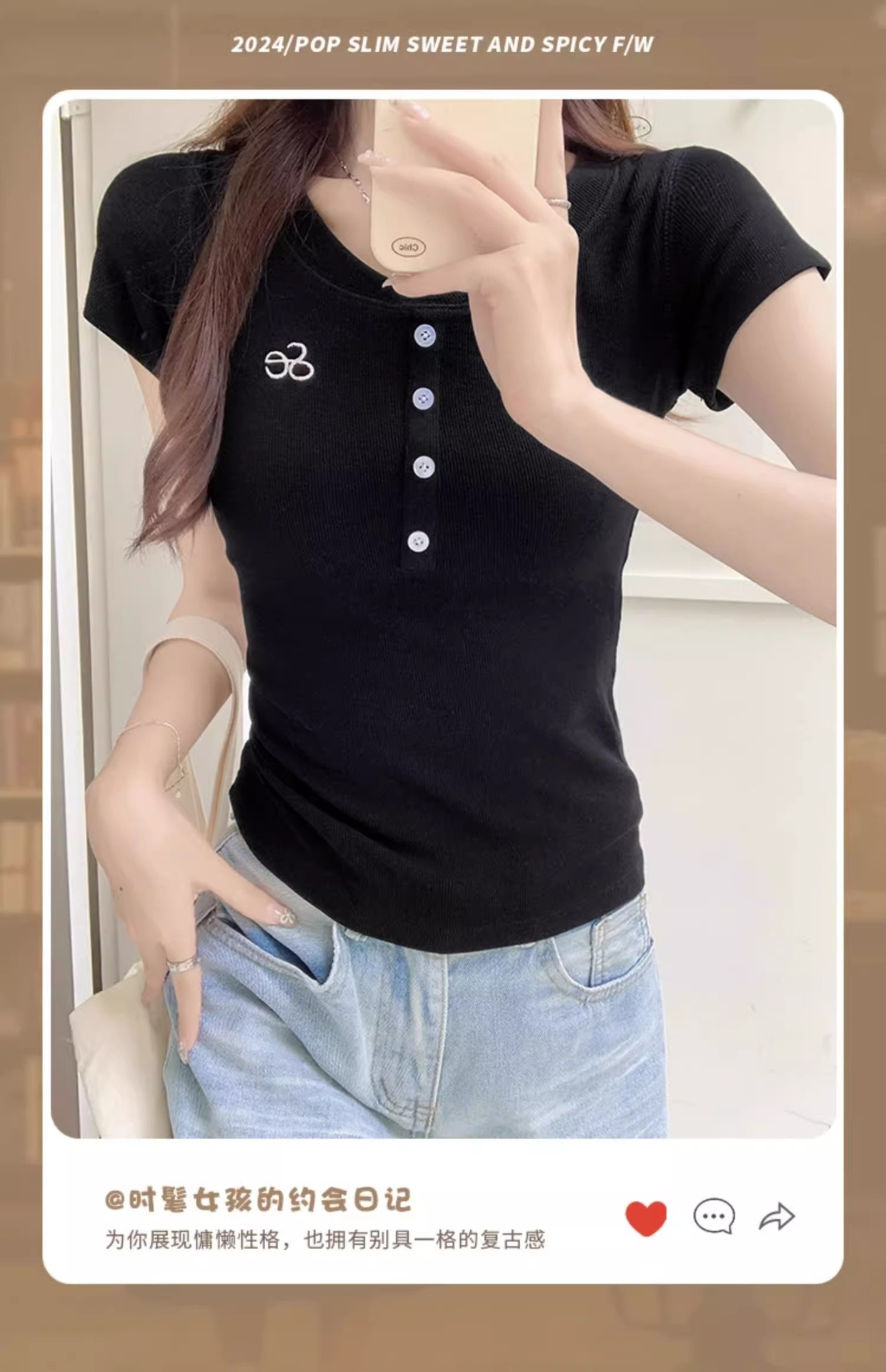 甜辣妹收腰显瘦半开领纽扣正肩短袖t恤女刺绣螺纹半袖夏季小上衣