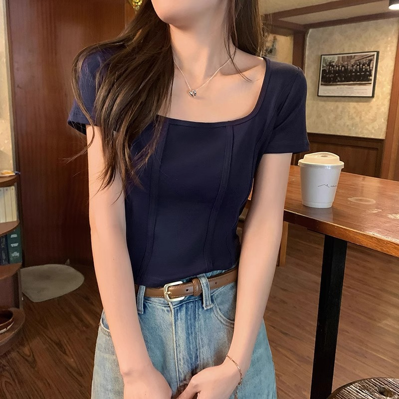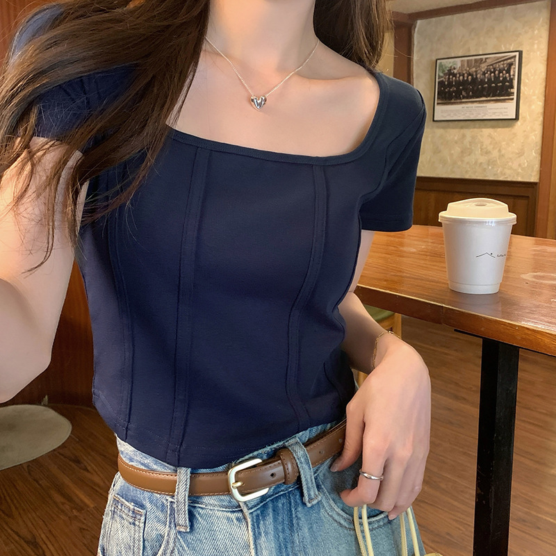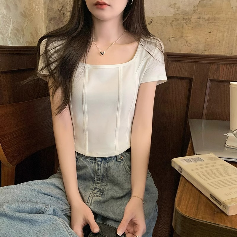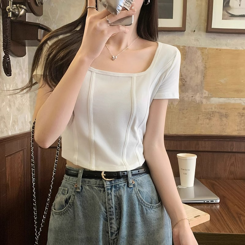 不规则鱼骨修身短款t恤女设计感方领正肩纯欲辣妹夏季短袖小上衣