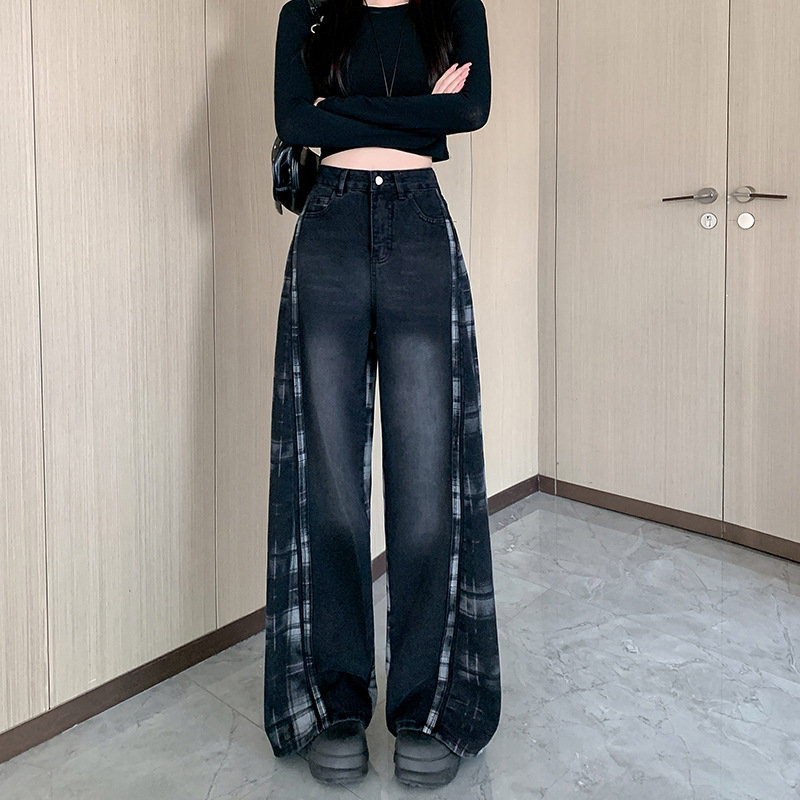 实拍实价~美式高街撞色格纹拼接牛仔裤女新款辣妹宽松垂感阔腿裤