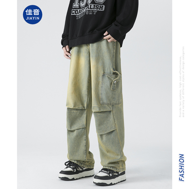 佳音男装∣黄泥复古伞兵工装牛仔裤男士高街宽松直筒设计感阔腿裤
