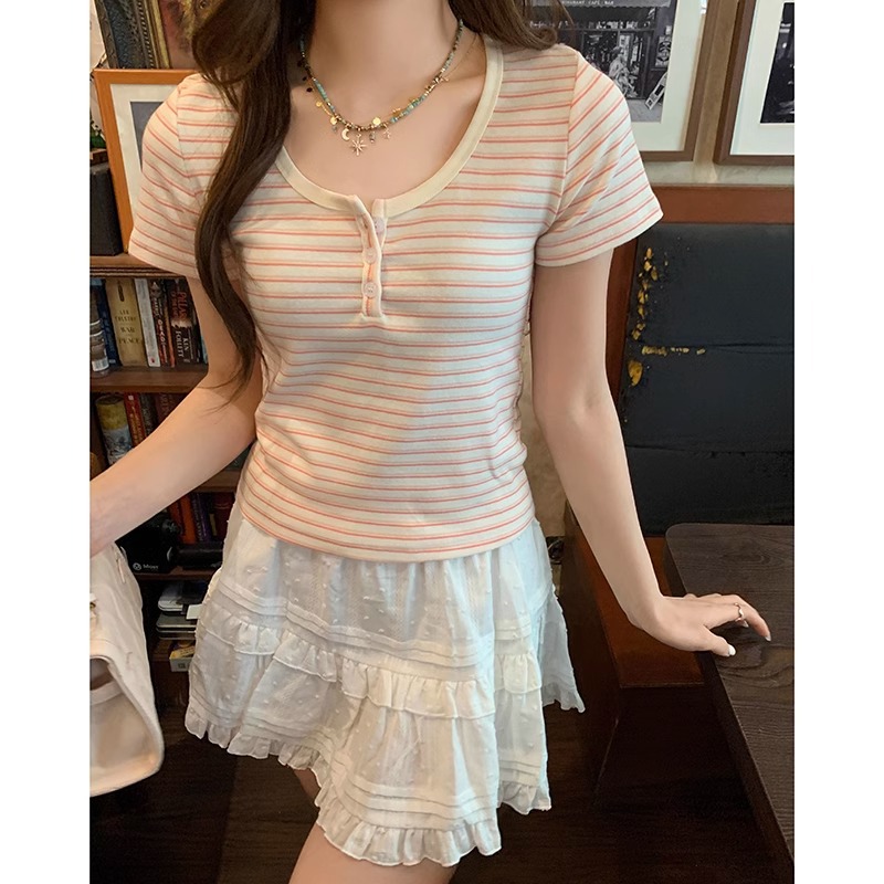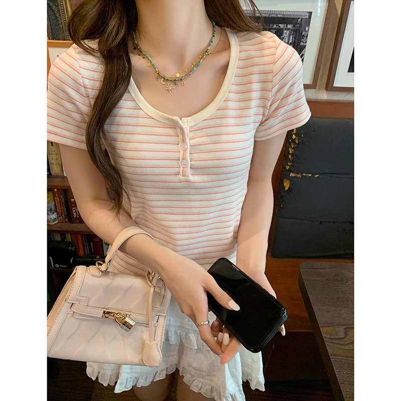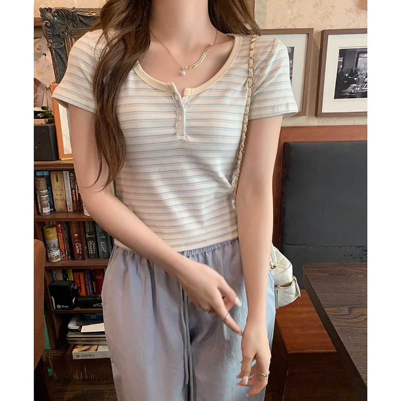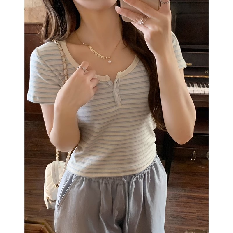 美式复古正肩条纹短袖t恤女春夏新款小众设计感纽扣短款上衣