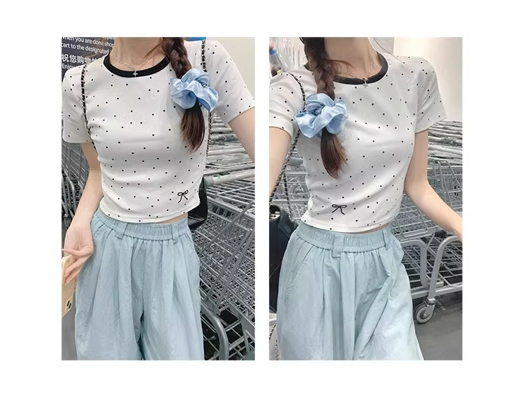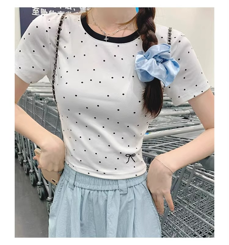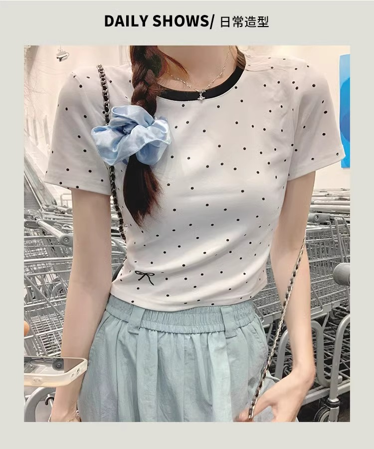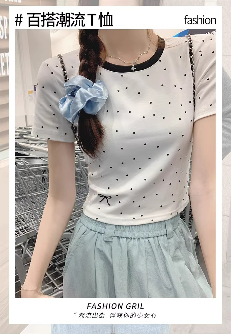 韩版夏季甜妹圆领拼接刺绣上衣短款蝴蝶结波点修身百搭女T恤