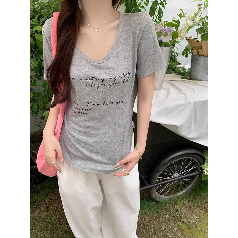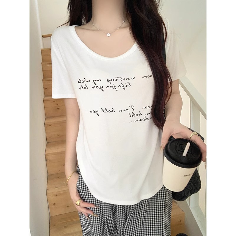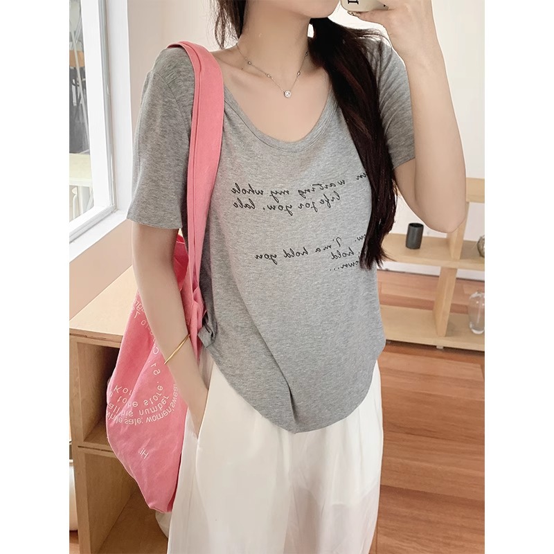 慵懒风大领口露锁骨薄款短袖字母印花不规则T恤女夏宽松遮肉上衣