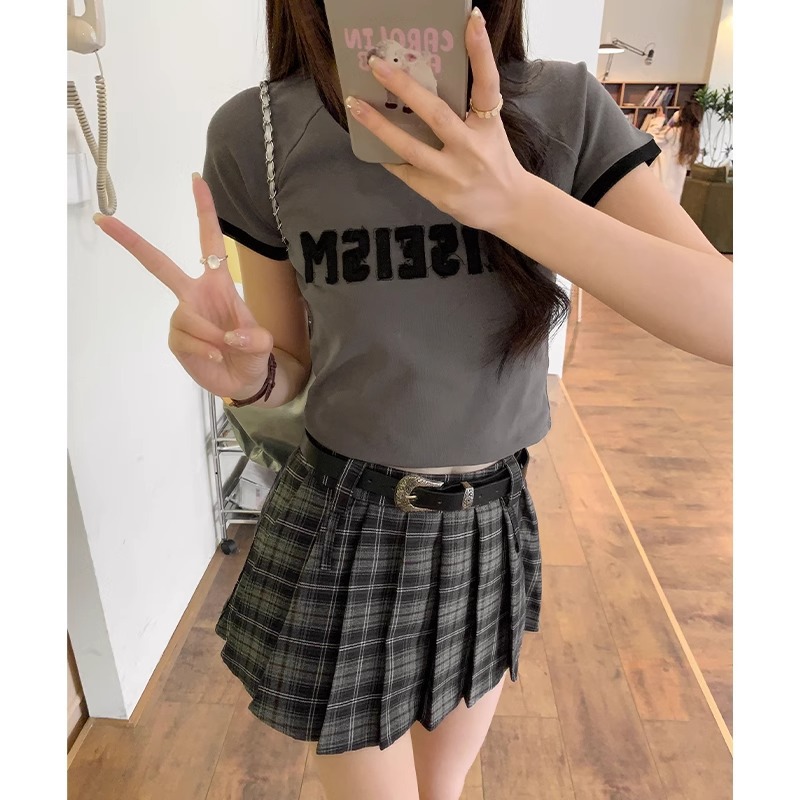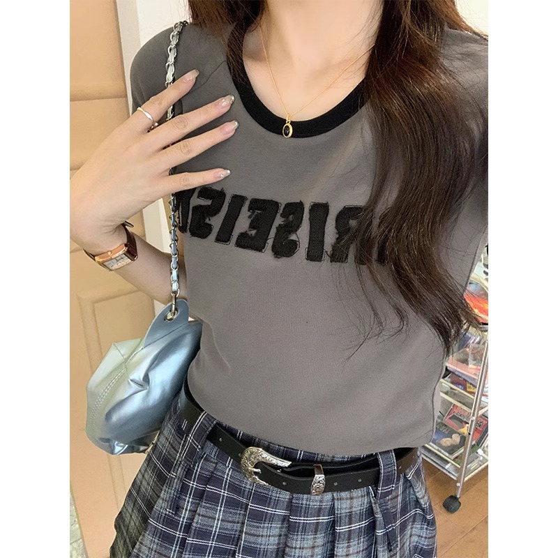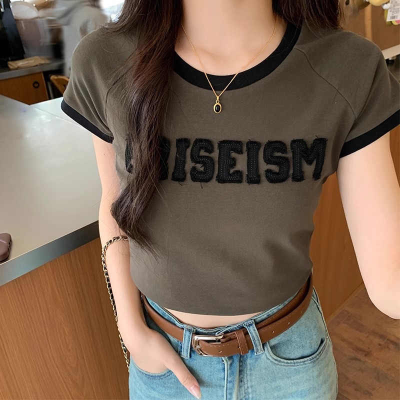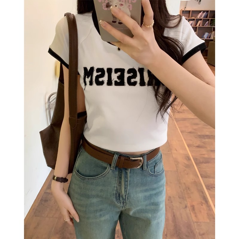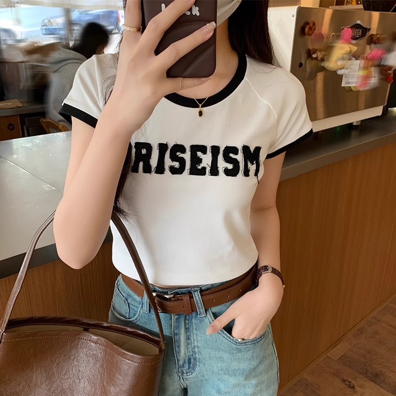 美式拼色短袖t恤女春夏新款圆领正肩小衫辣妹修身短款漏肚脐上衣
