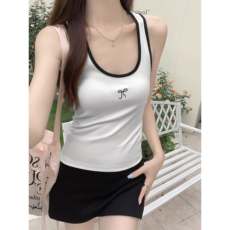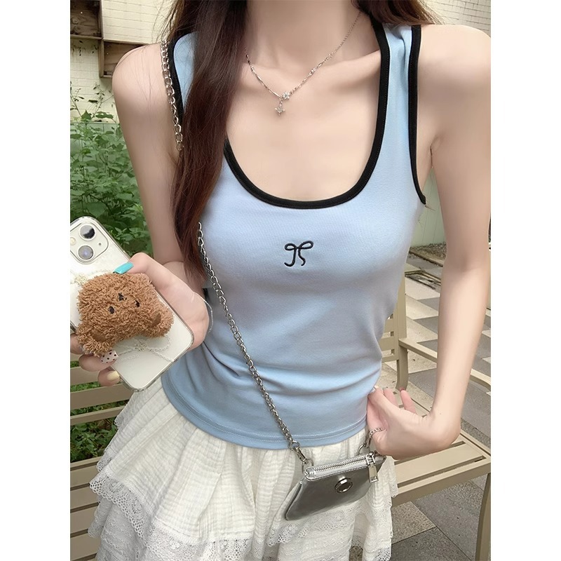 夏季甜辣妹露锁骨蝴蝶结刺绣工字型背心吊带女显瘦修身遮副乳上衣