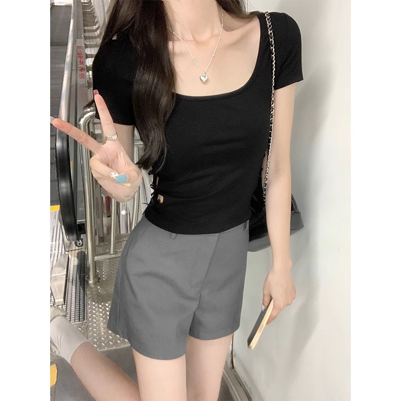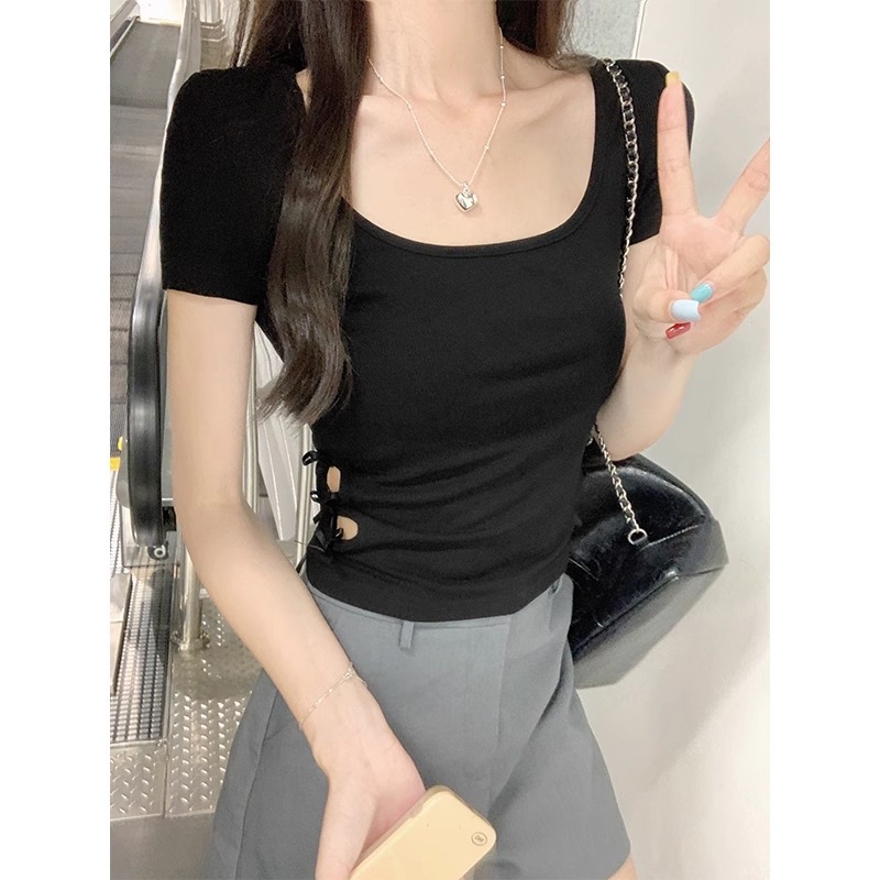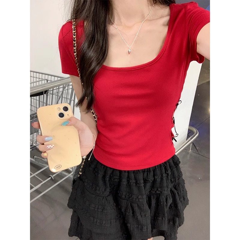 红色法式复古方领露锁骨气质蝴蝶结镂空夏季短袖T恤修身显瘦上衣