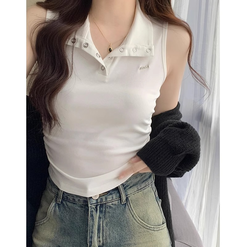 Polo衫翻领吊带背心女春夏新款纯欲辣妹褶皱无袖坎肩紧身内搭上衣