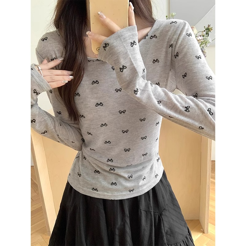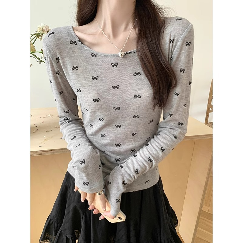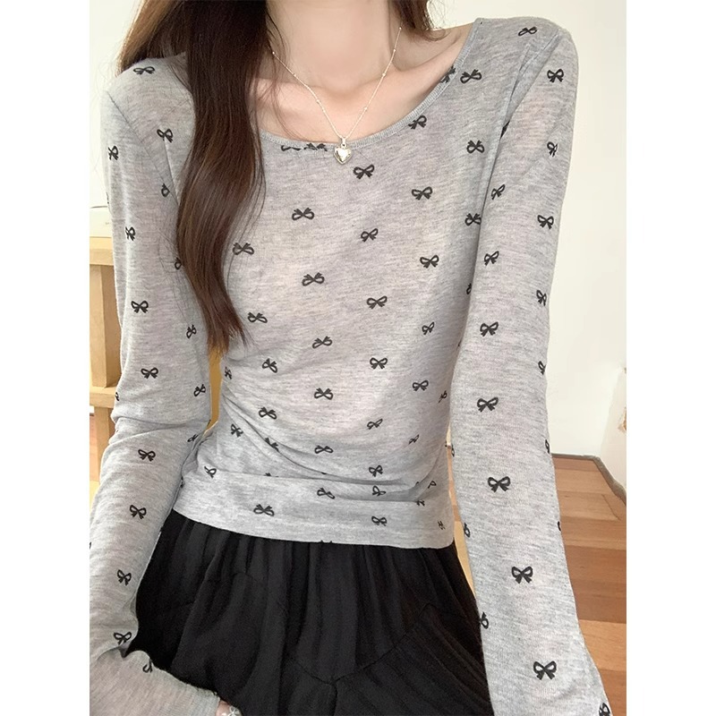 大圆领露锁骨微透薄款长袖T恤女夏蝴蝶结印花修身显瘦bm防晒上衣