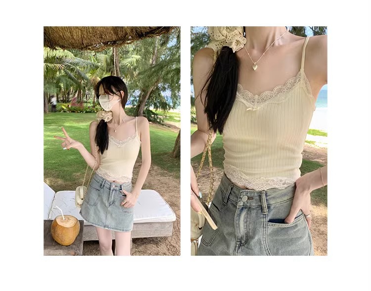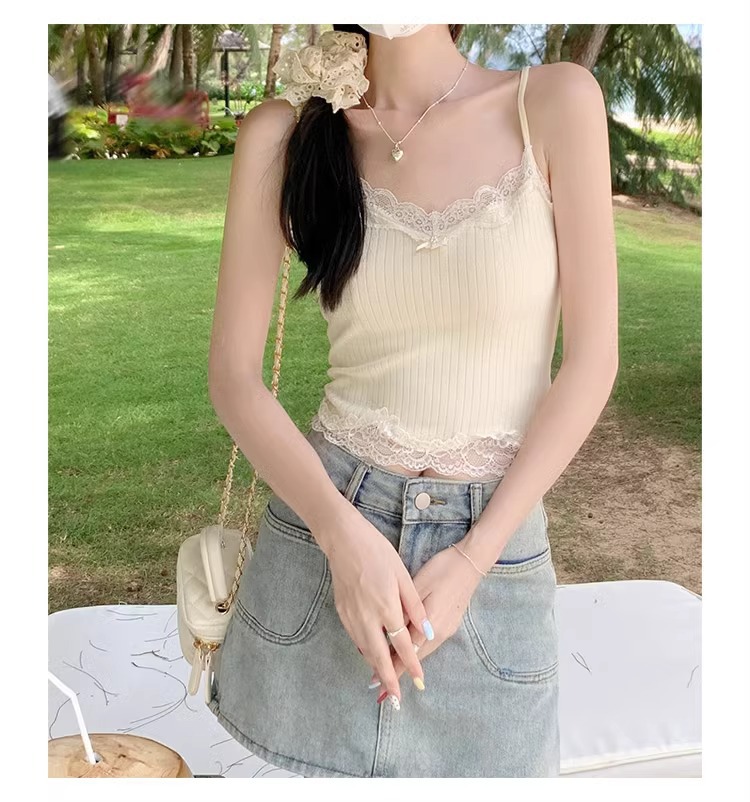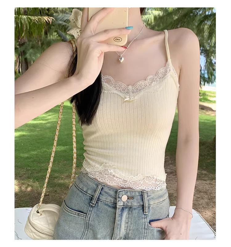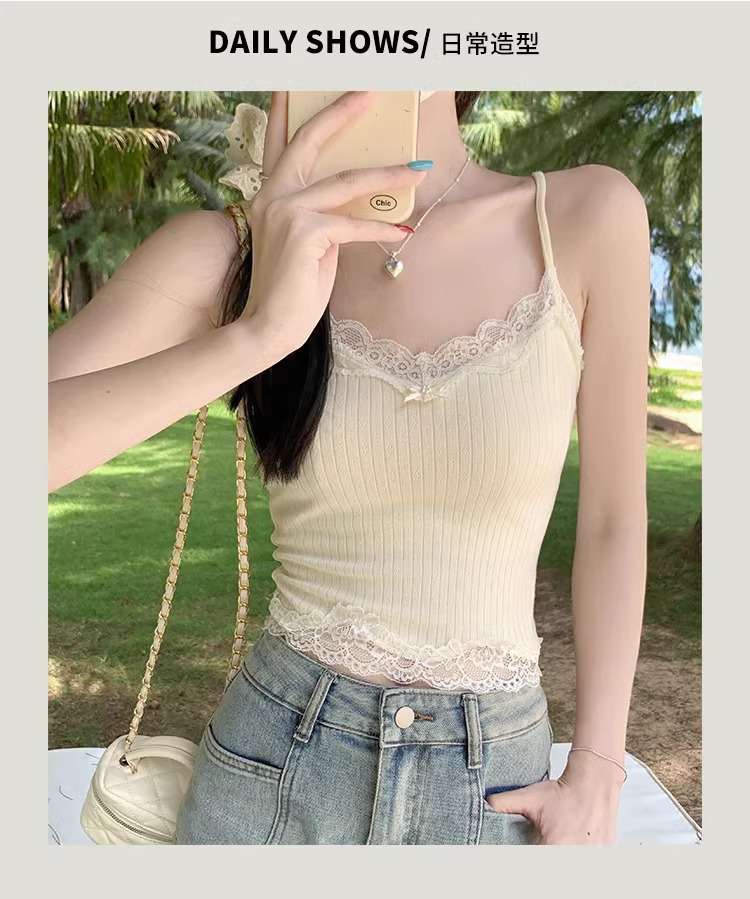 蕾丝花边性感低领小吊带背心女外穿夏季bm修身短款蝴蝶结纯欲上衣