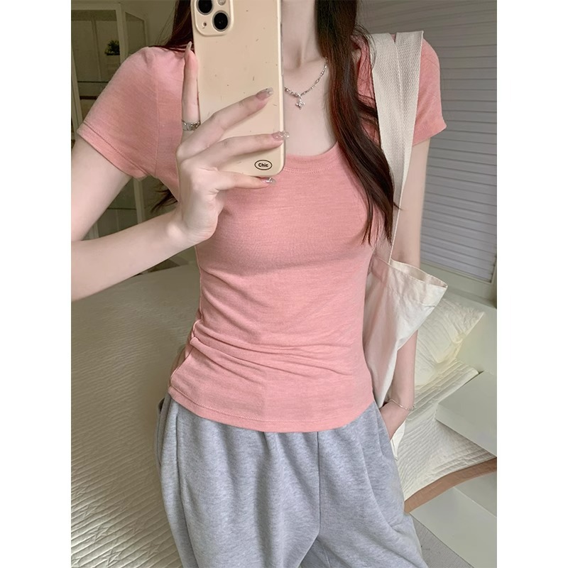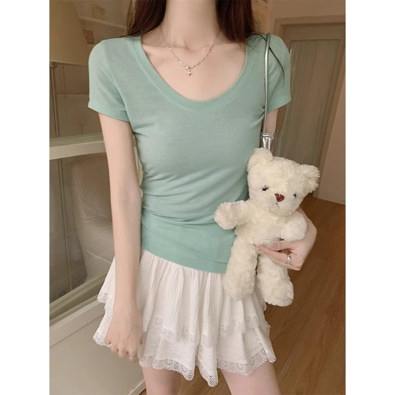 夏季弹力上衣柔软透气材质薄荷绿百搭修身短袖纯欲内搭T恤女