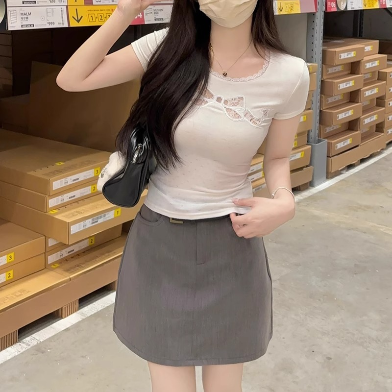 纯欲性感胸前镂空蕾丝蝴蝶结短袖T恤女夏修身显瘦甜辣妹短款上衣