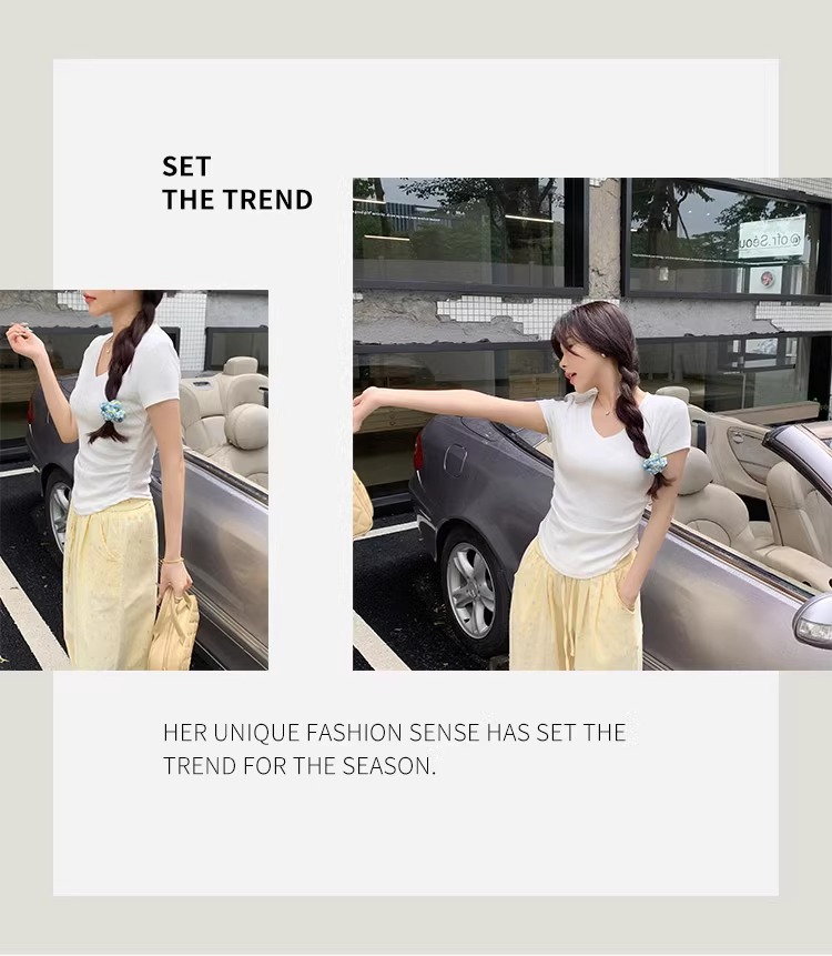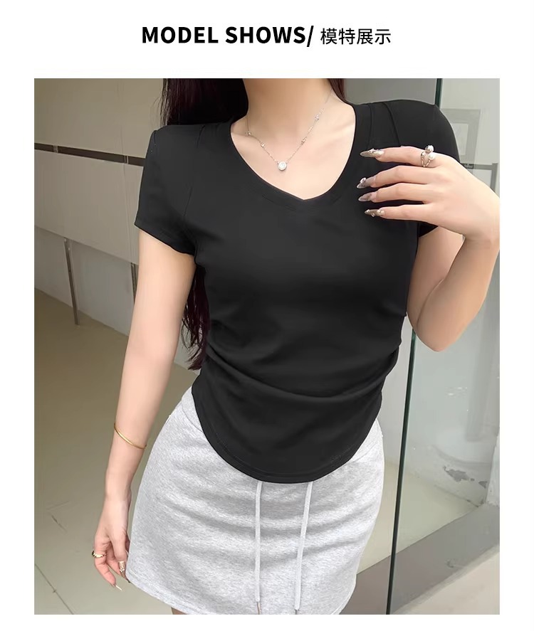 美式复古纯色简约V领上衣甜辣妹收腰修身性感短袖气质夏季女款T恤