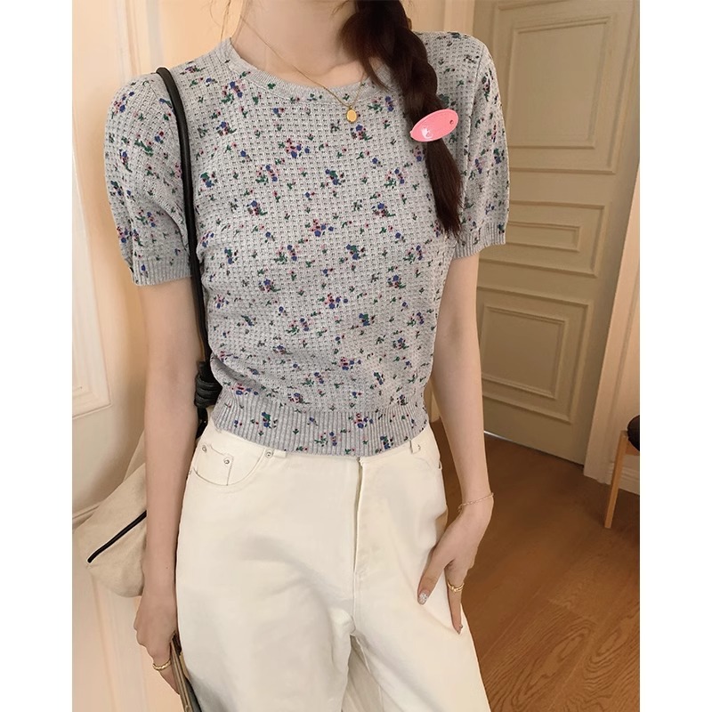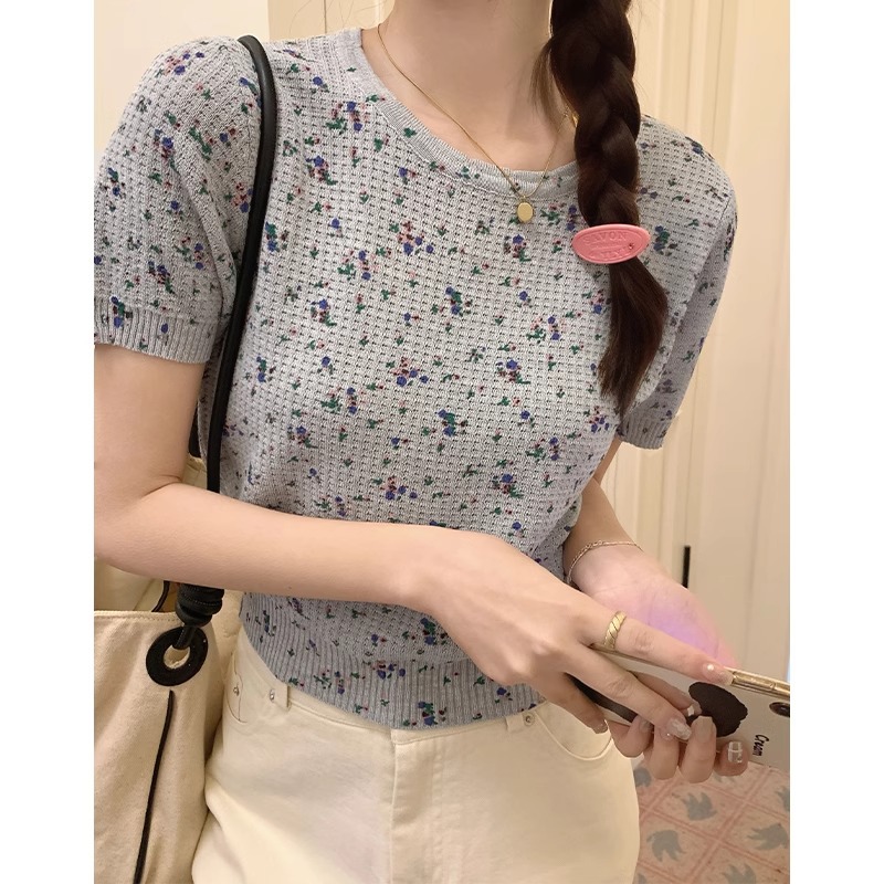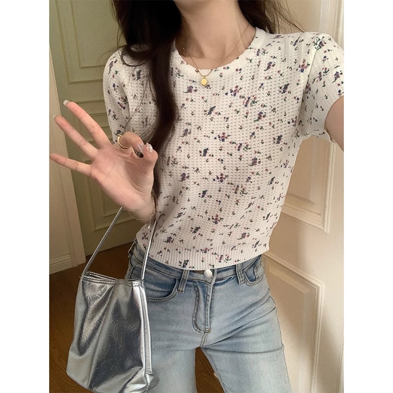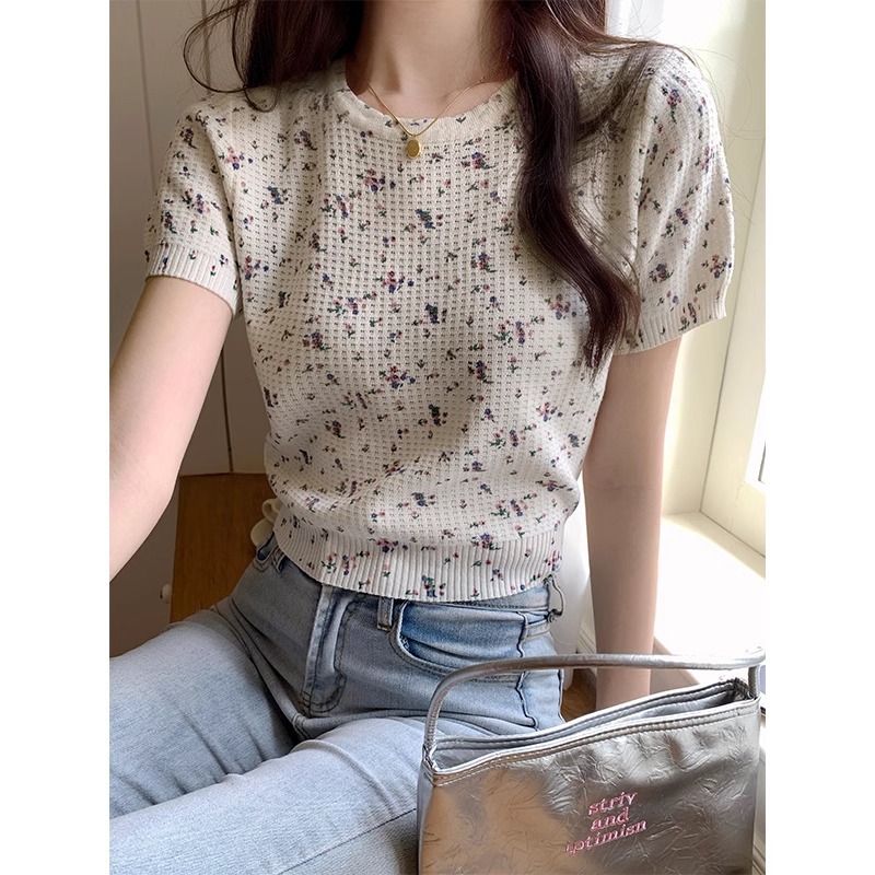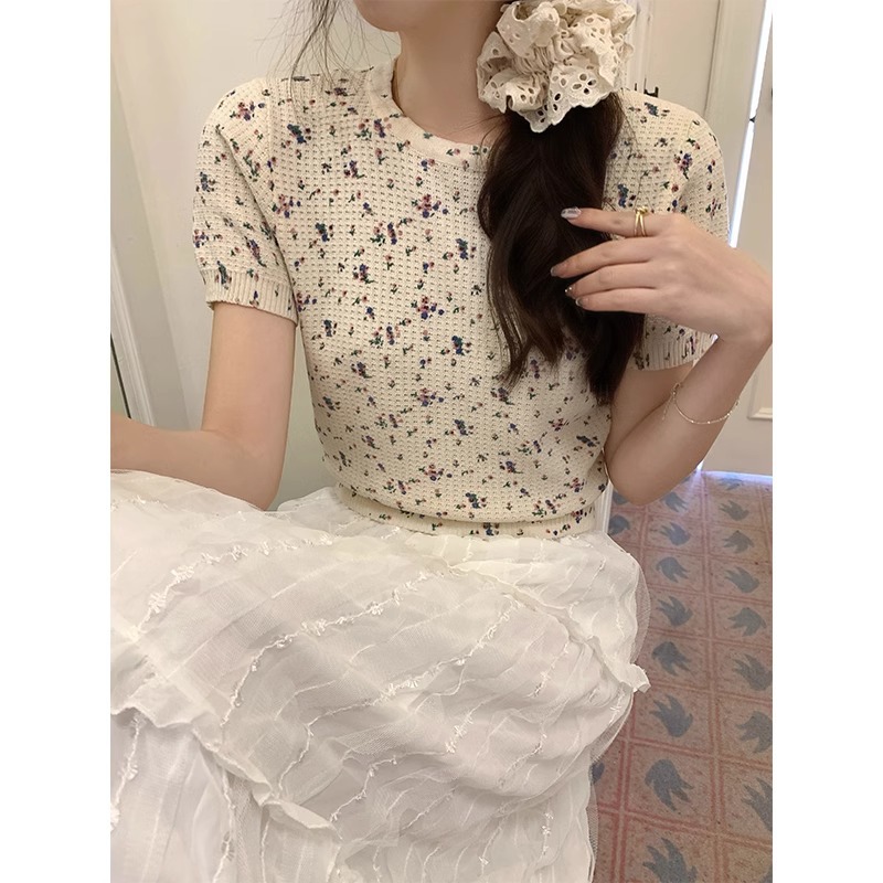 bm短款轻熟风碎花正肩针织短袖t恤女夏季设计感镂空法式气质上衣