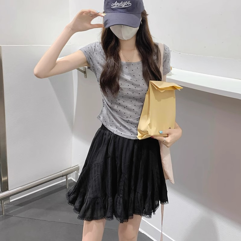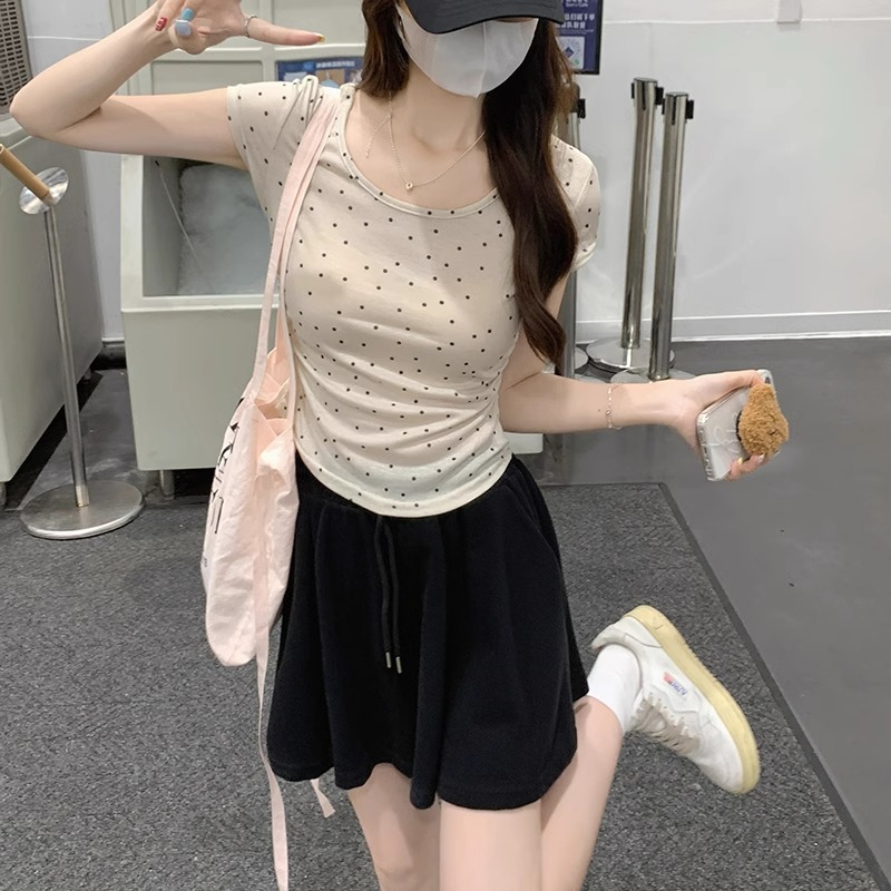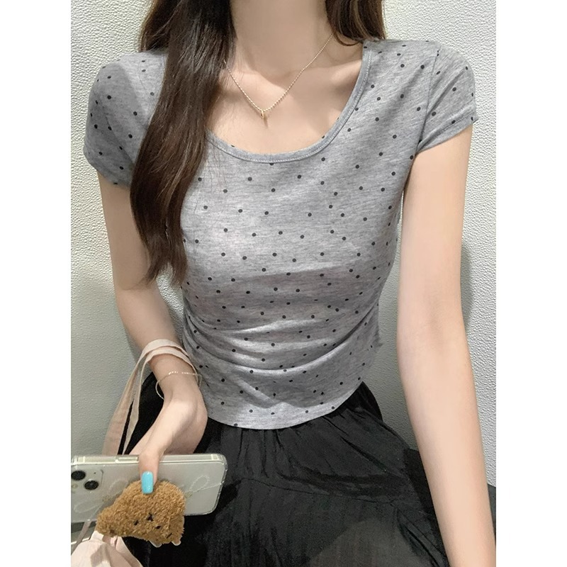 Polka dot U-neck short sleeved t-shirt for women with exposed collarbones in summer, pure desire, sweet and spicy design sense, niche temperament, slim fit half sleeved top