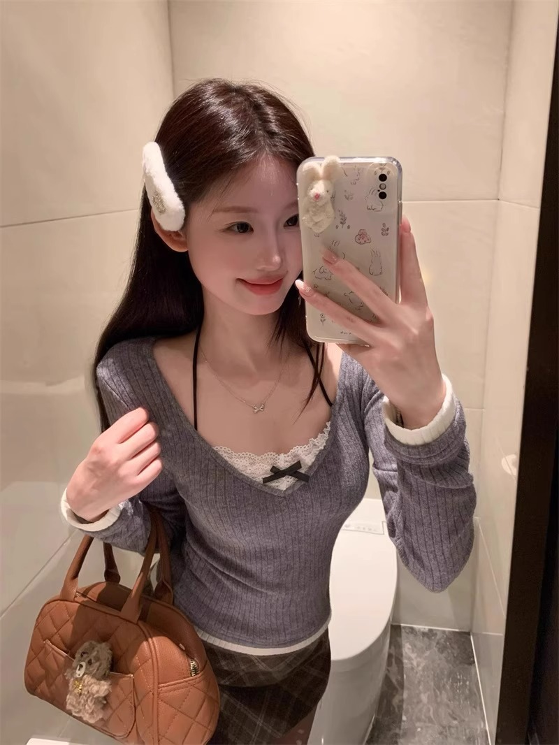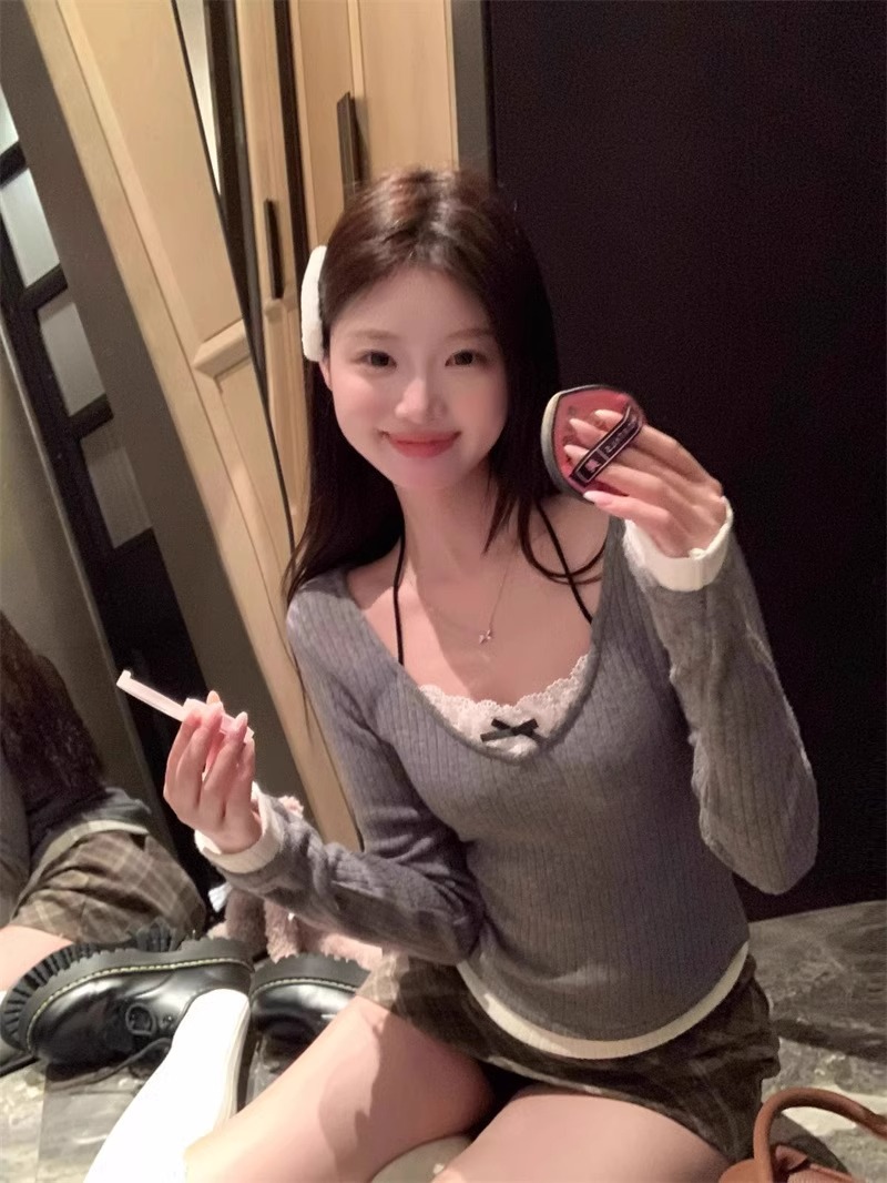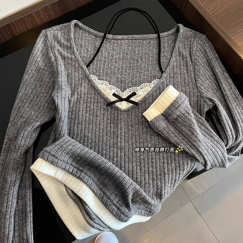 假两件挂脖长袖t恤女春秋辣妹纯欲修身蕾丝设计感打底衫内搭上衣