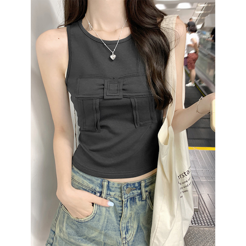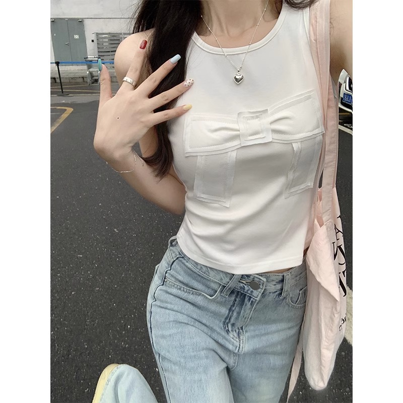 夏季新款法式纯欲蝴蝶结设计感小众圆领吊带背心女修身无袖小上衣