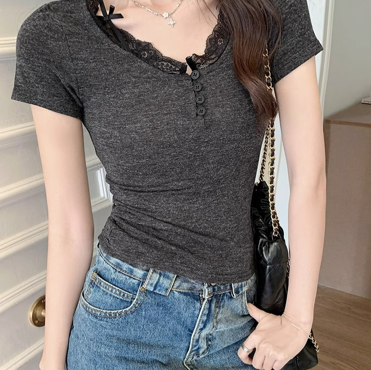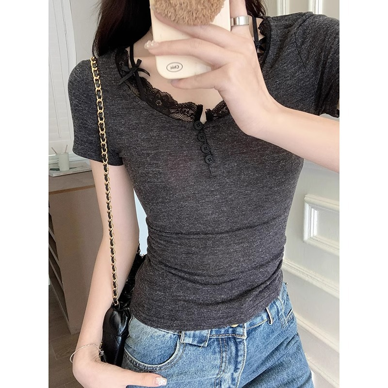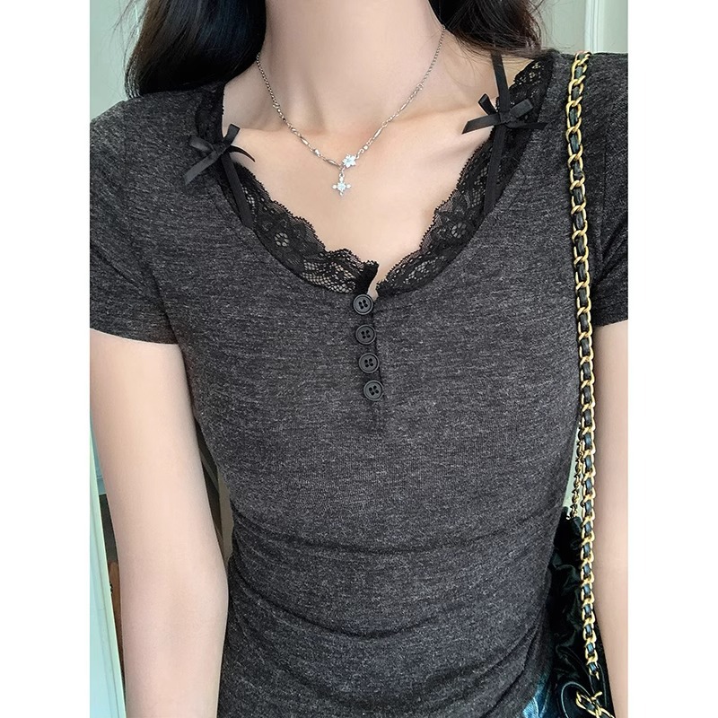 夏季深灰色蕾丝花边纽扣半开领挂脖假两件短袖正肩T恤显瘦上衣女