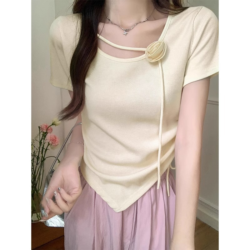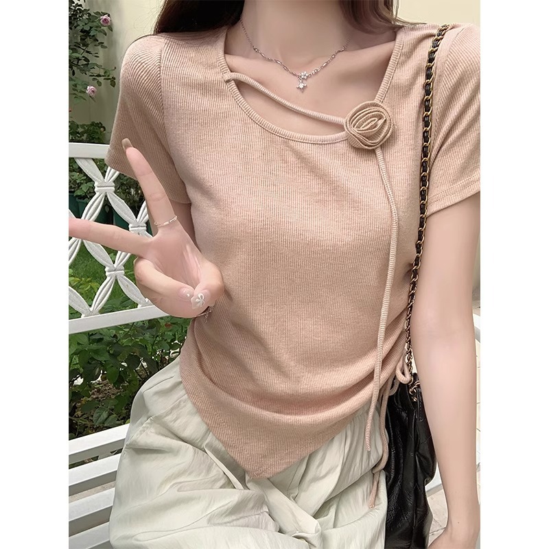 韩版夏季甜妹纯色蝴蝶结上衣立体修身夏季抽皱短袖修身T恤女